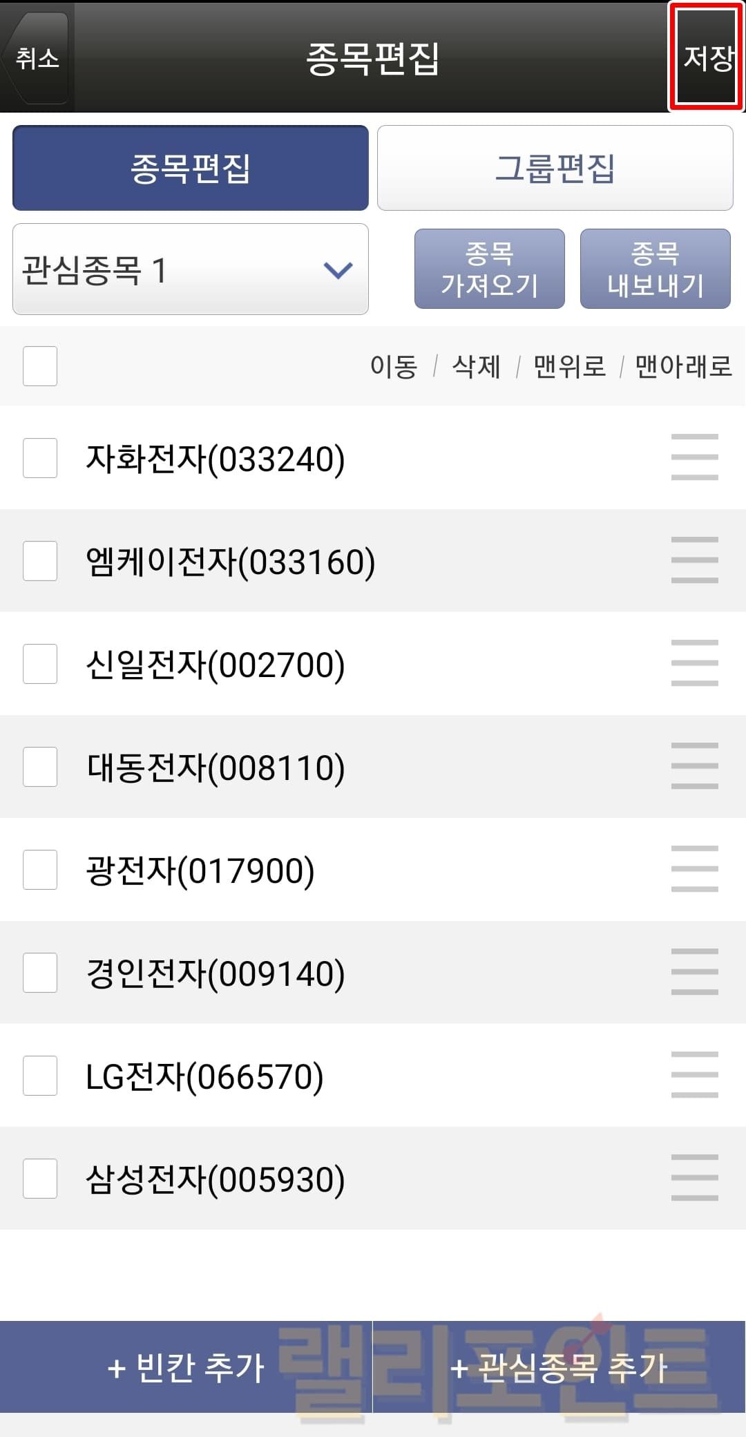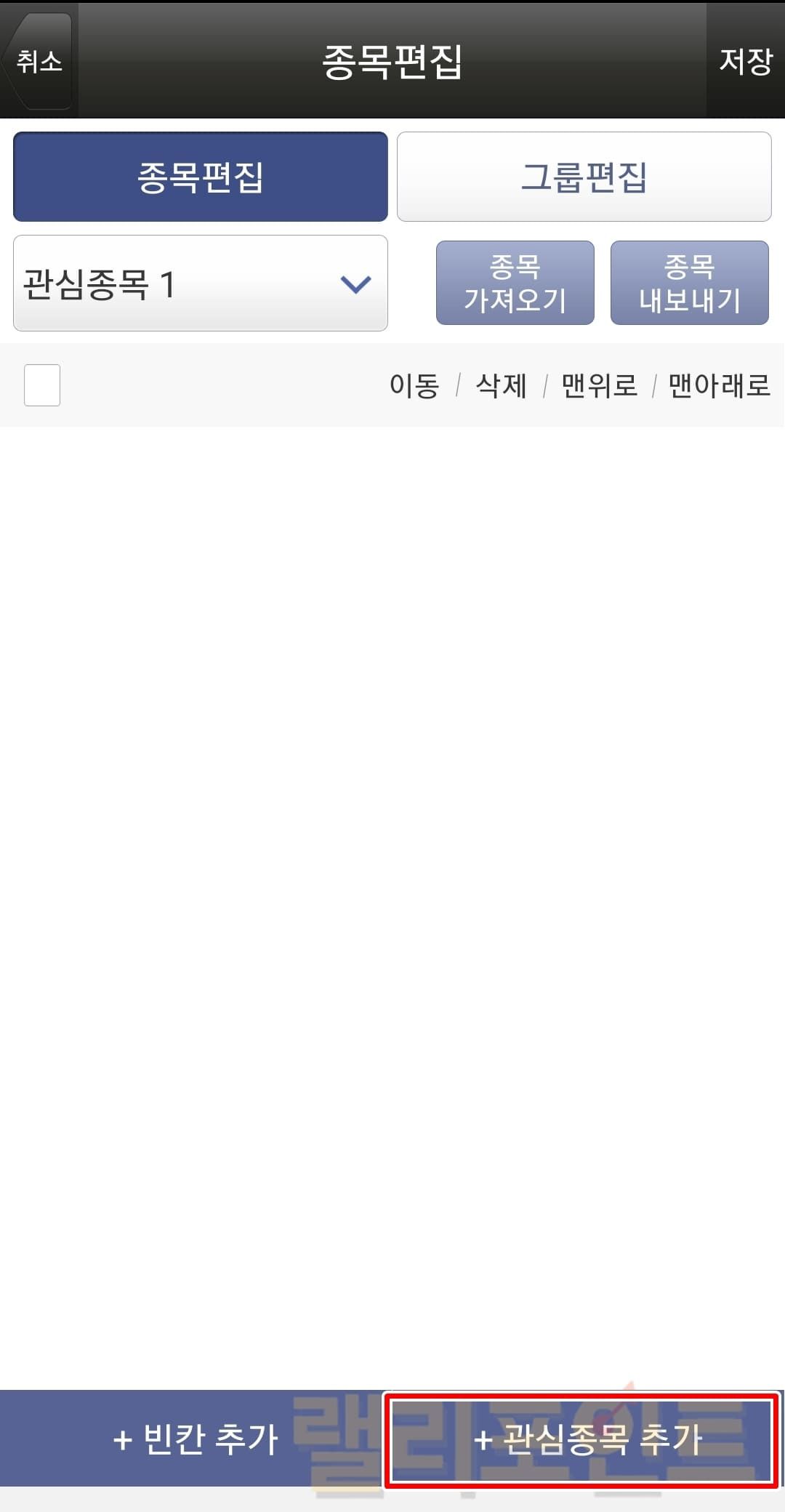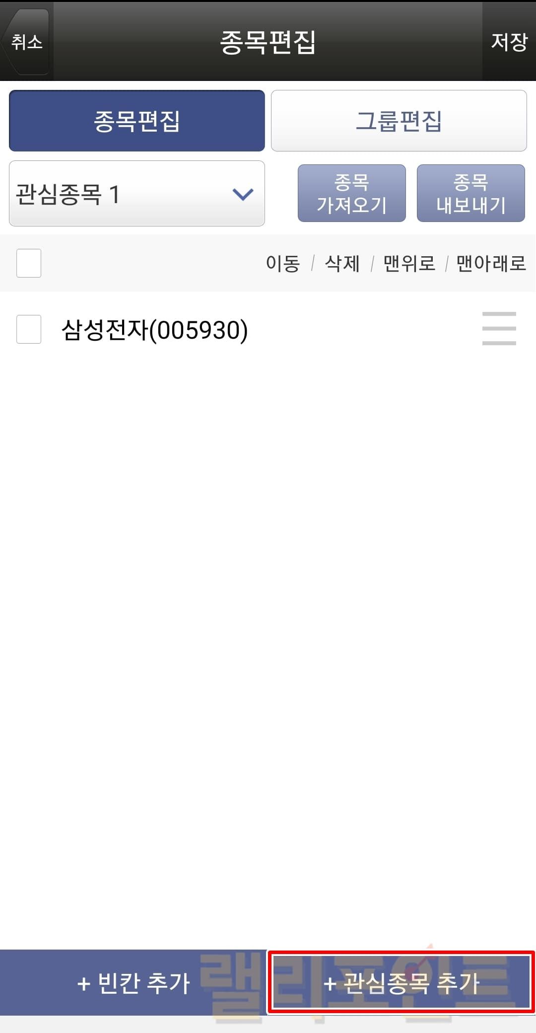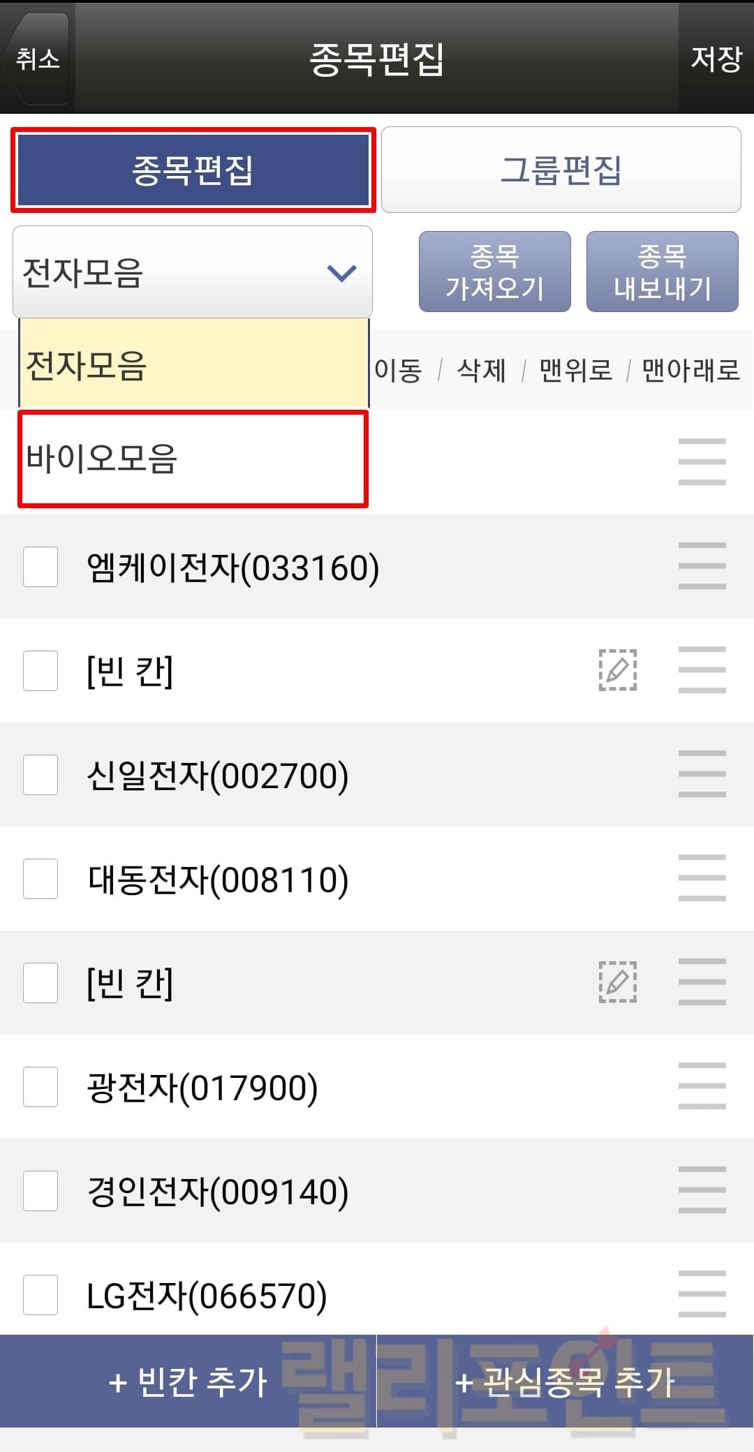 관심그룹이 추가되면 종목편집에서 생성한 그룹을 선택합니다.