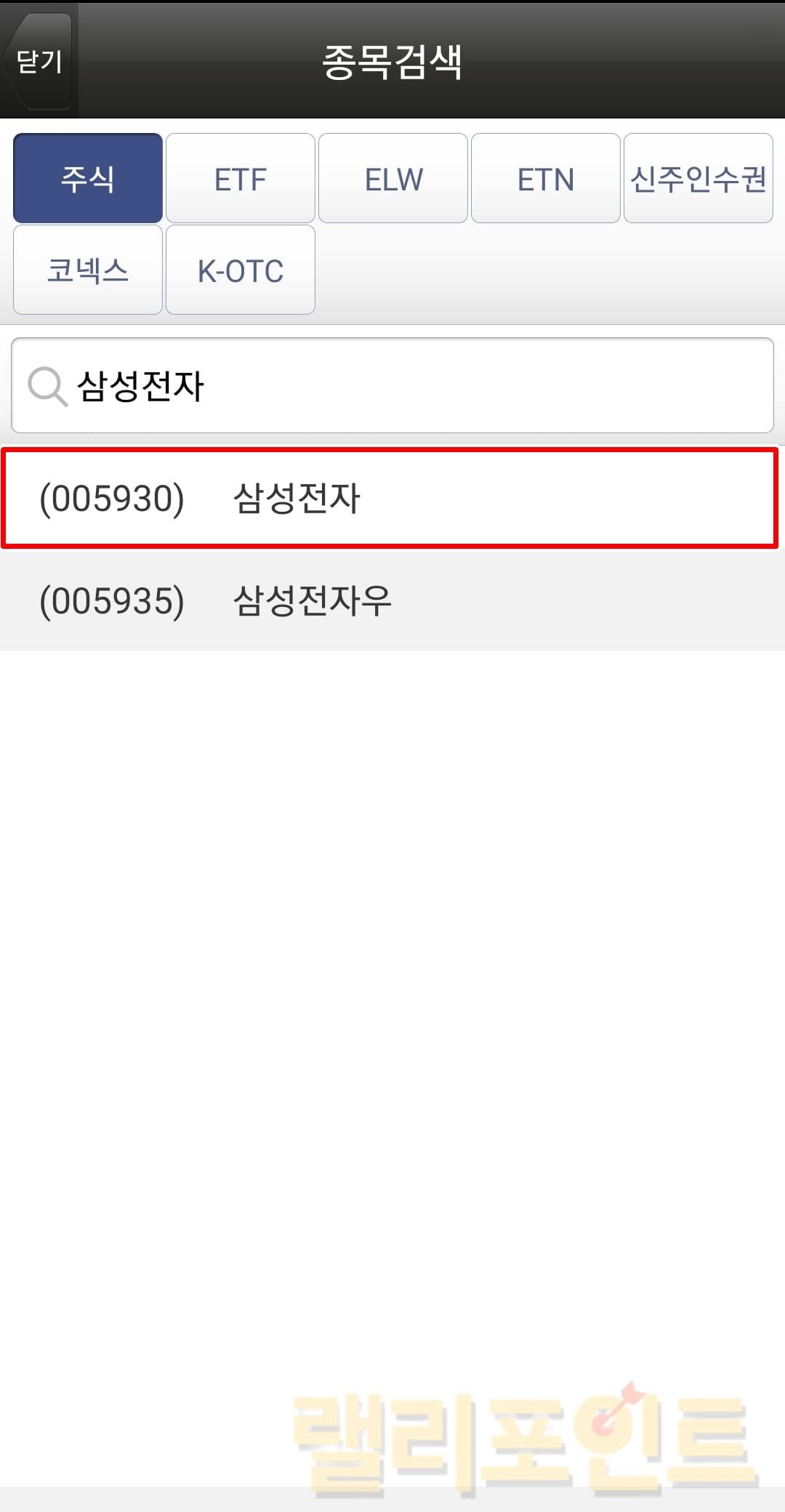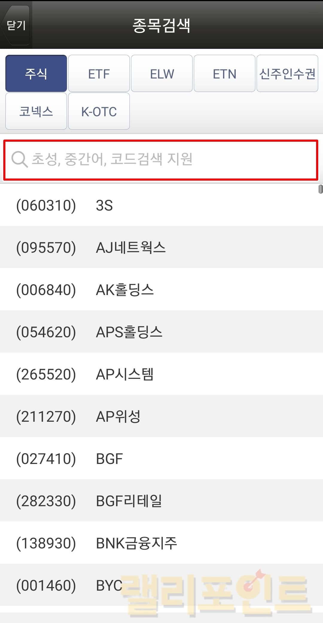 추가하고 싶은 종목의 초성, 중간어, 코드를 입력해서 검색합니다.