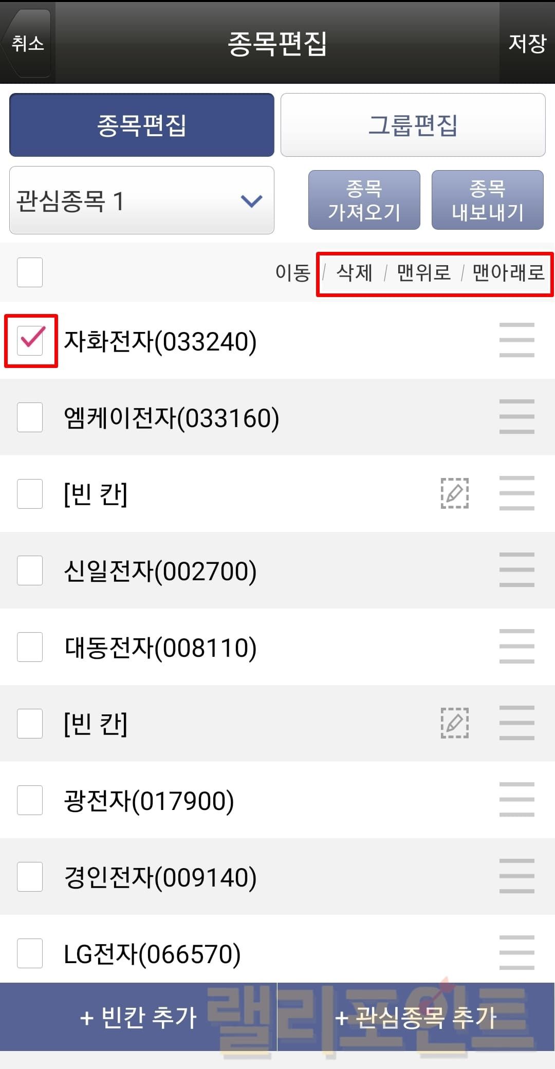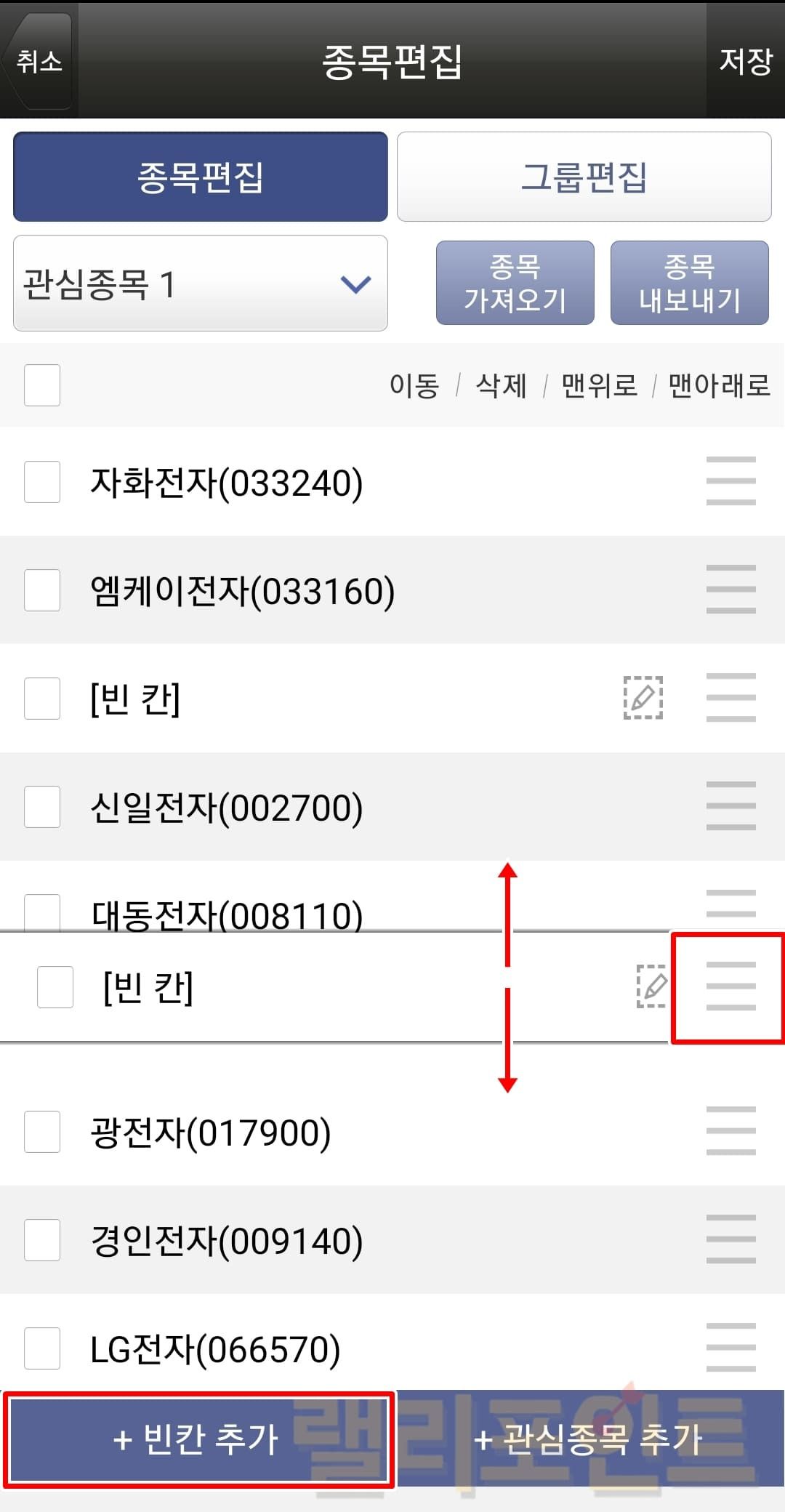 +빈칸 추가를 눌러서 관심종목간의 공백을 만들어서 구분해서 볼 수 있습니다. 빈칸은 우측 세줄 버튼을 눌러 자유롭게 위치를 변경할 수 있습니다. (종목들도 마찬가지로 세줄 버튼을 눌러 위치를 바꿀 수 있음.)