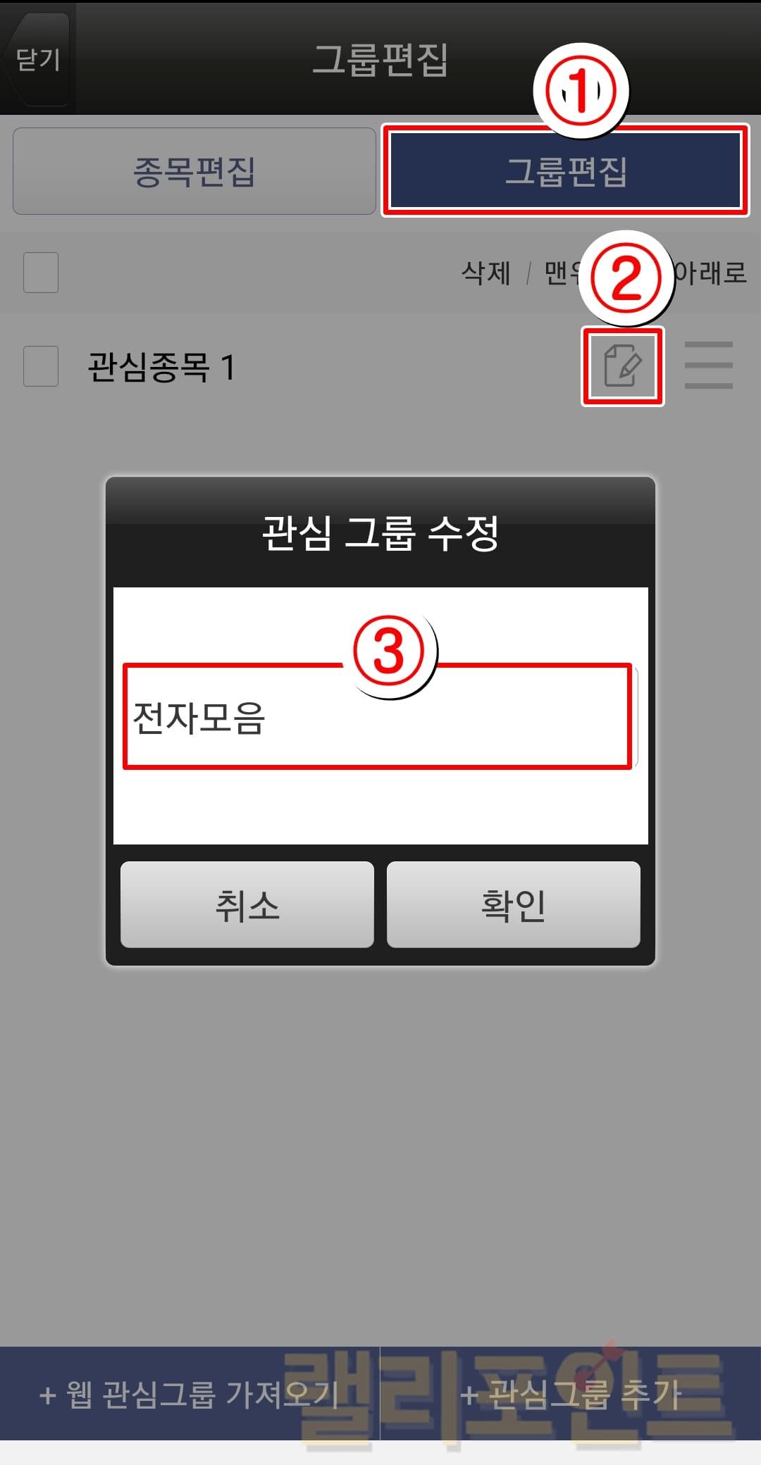 관심종목 메뉴 > 종목편집 클릭 > 그룹편집 > 수정 버튼을 눌러 이름을 변경해주시면 됩니다.