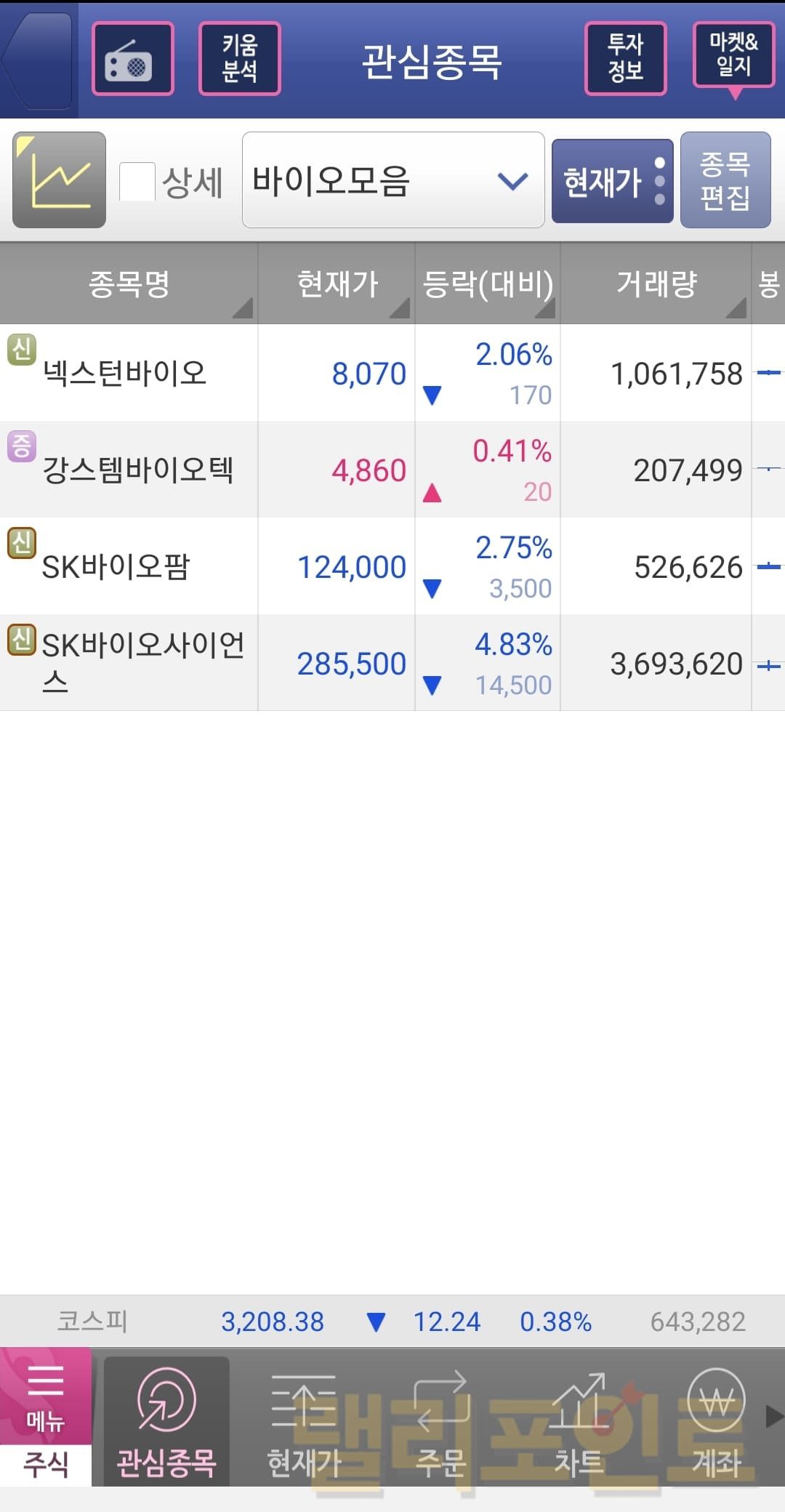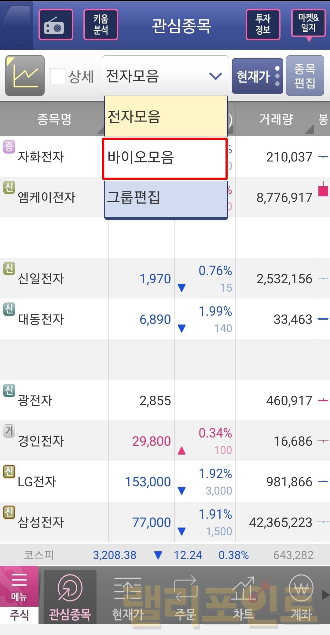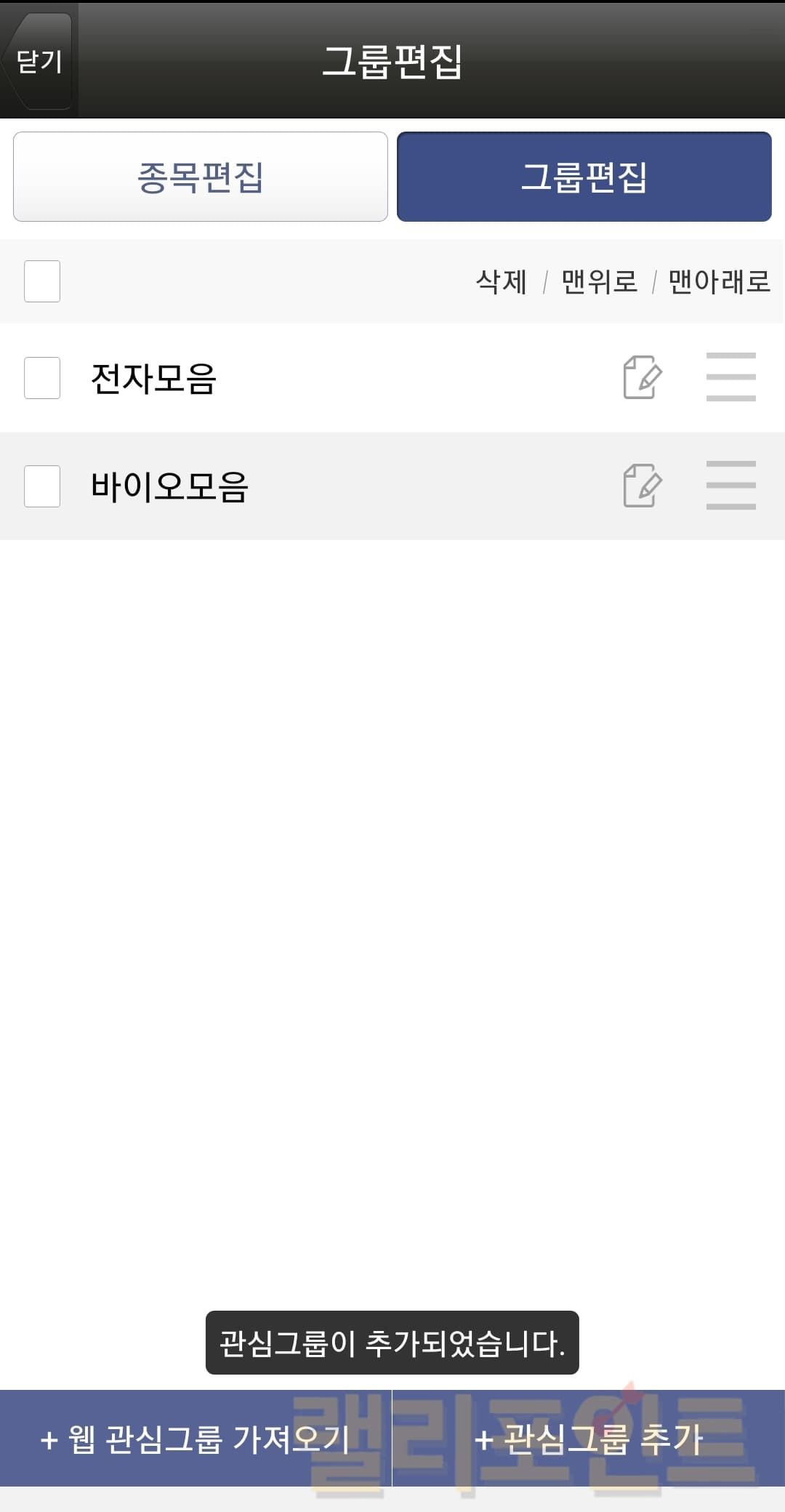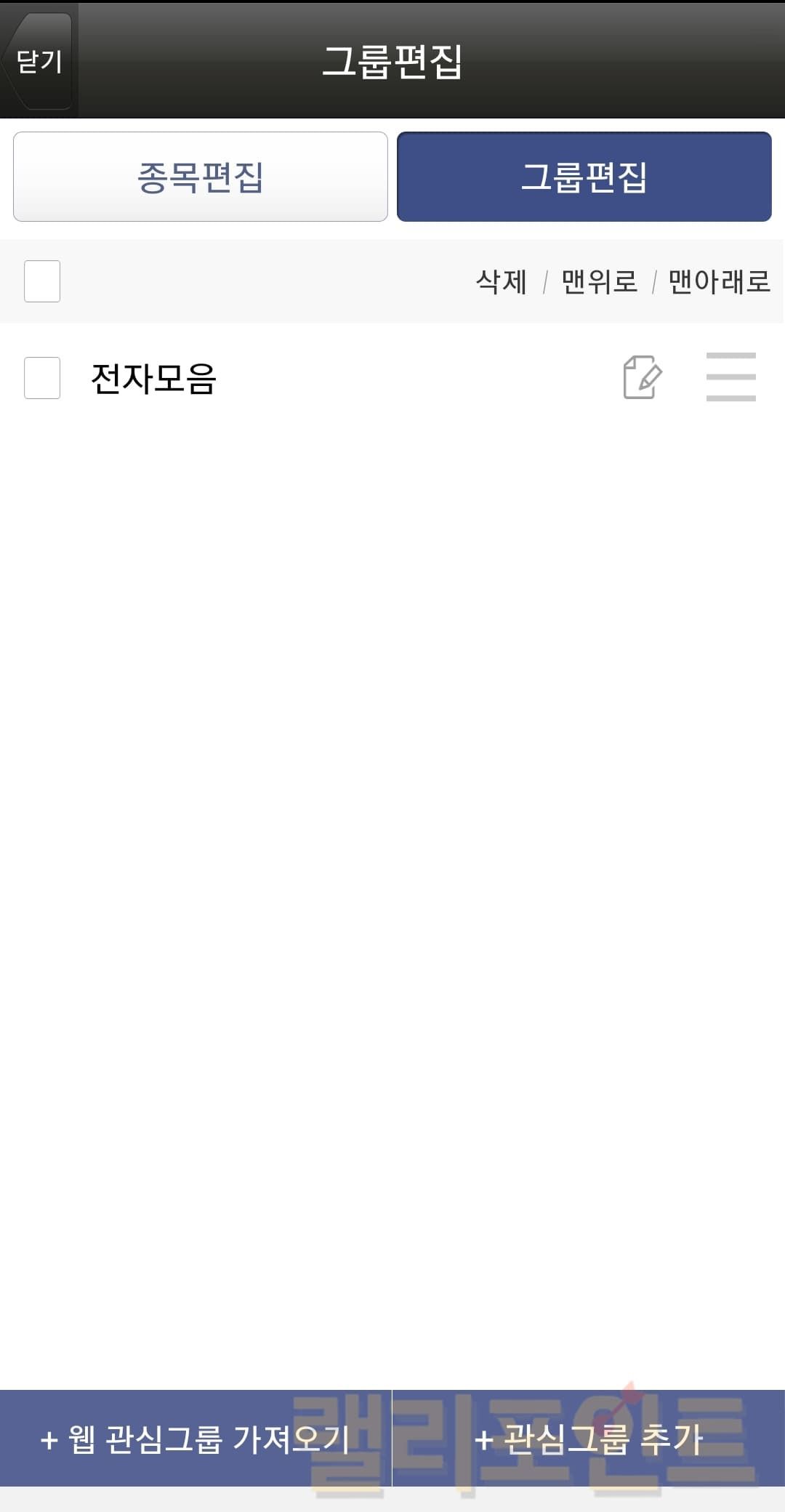 영웅문 관심종목에서 해당 그룹을 선택합니다.