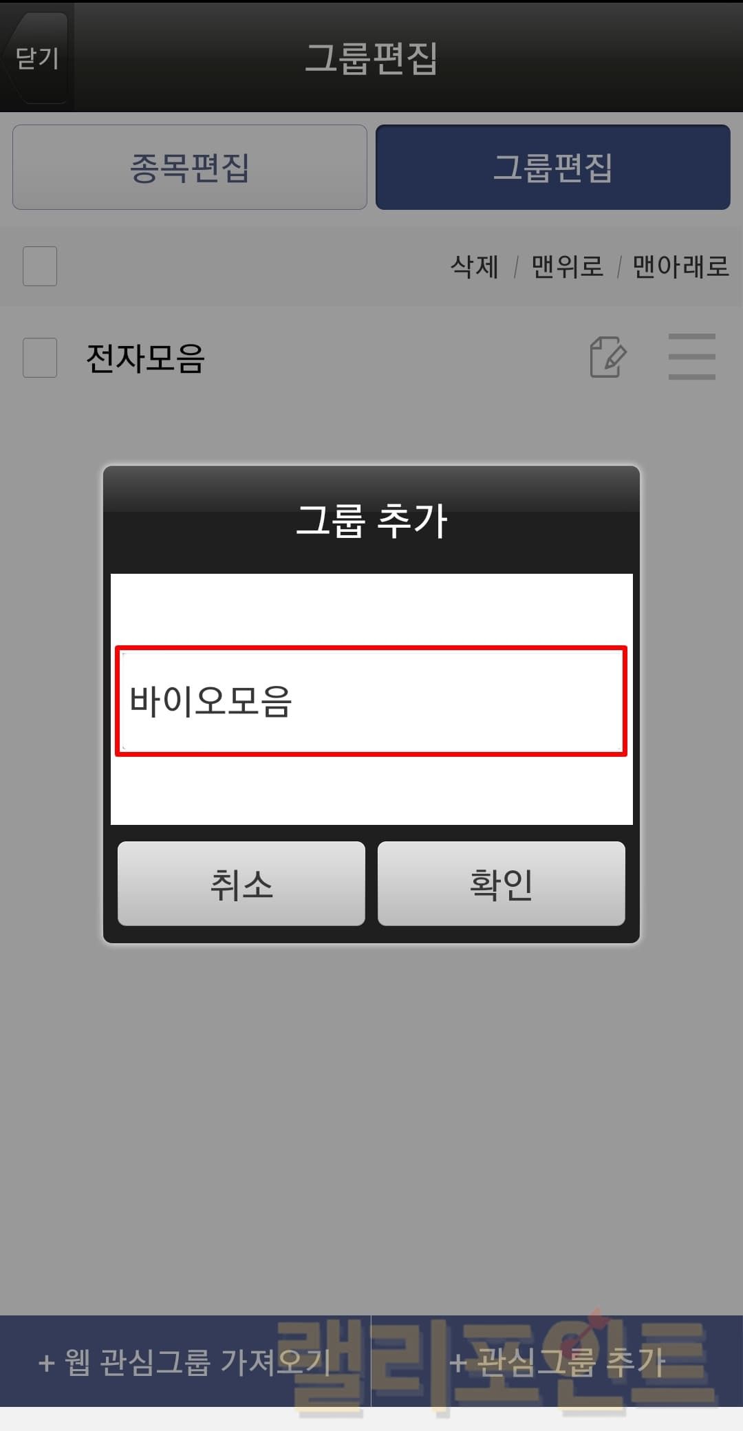 하나의 관심그룹에 너무 많은 종목들을 집어넣을 경우 나중에는 보기도 불편할 뿐더러 이 종목이 왜 내가 관심을 가지게 되었는지도 헷갈리게 될 수 있습니다. 그래서 관심그룹을 특징에 맞게 이름을 바꿔 등록시키는 것이 좋습니다.