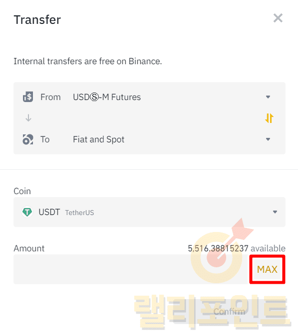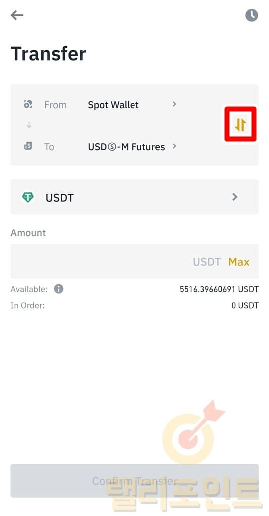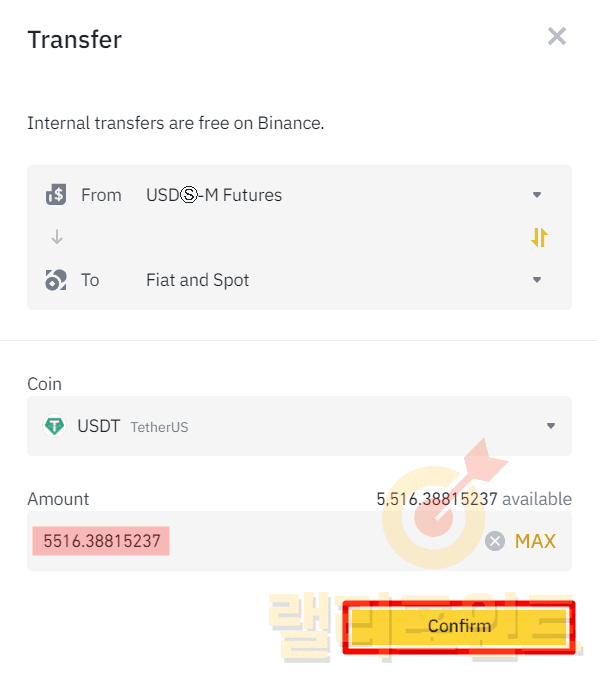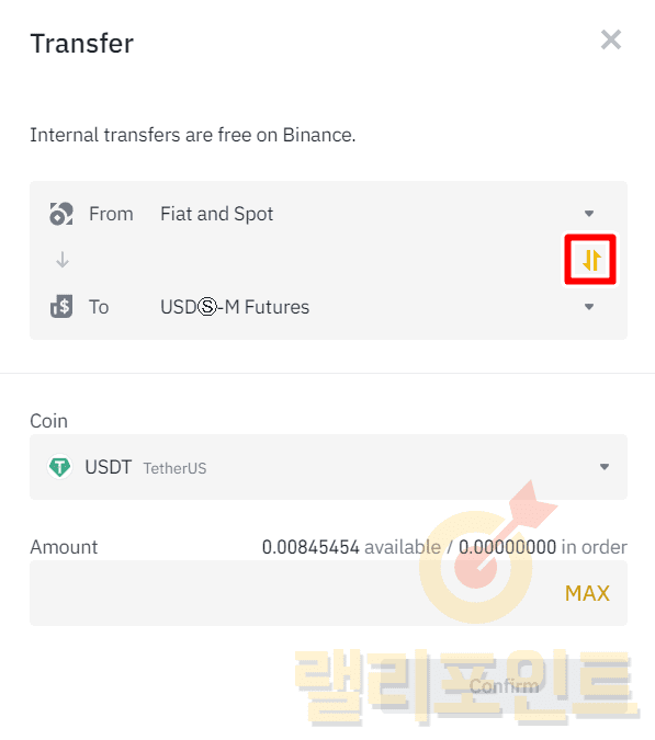 1. 전환버튼을 눌러 FROM에 USDⓢ-M Futures, To에 Fiat and Spot이 오도록 설정합니다.