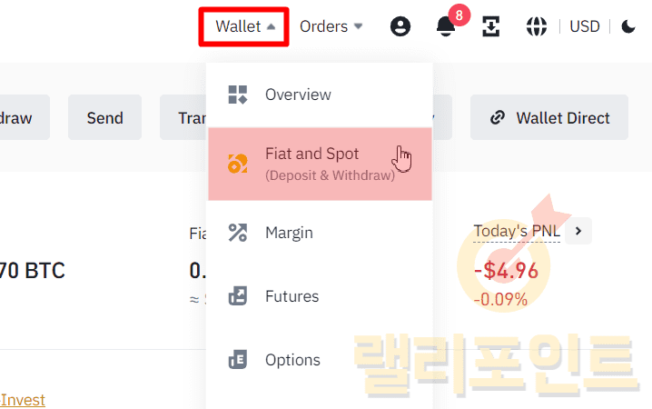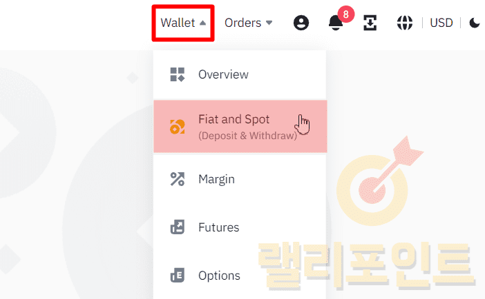 1. 상단 Wallet > Fiat and Spot을 누릅니다.