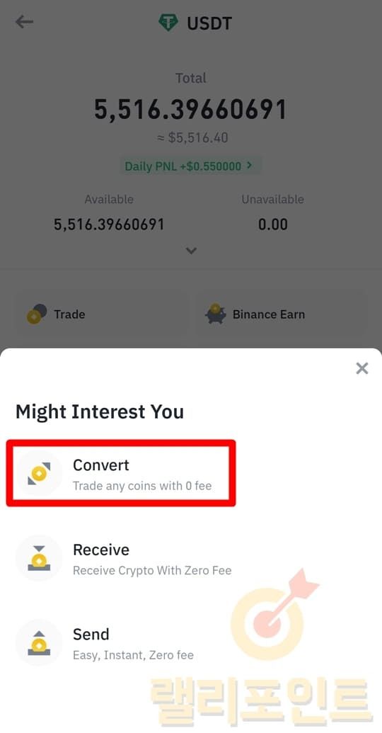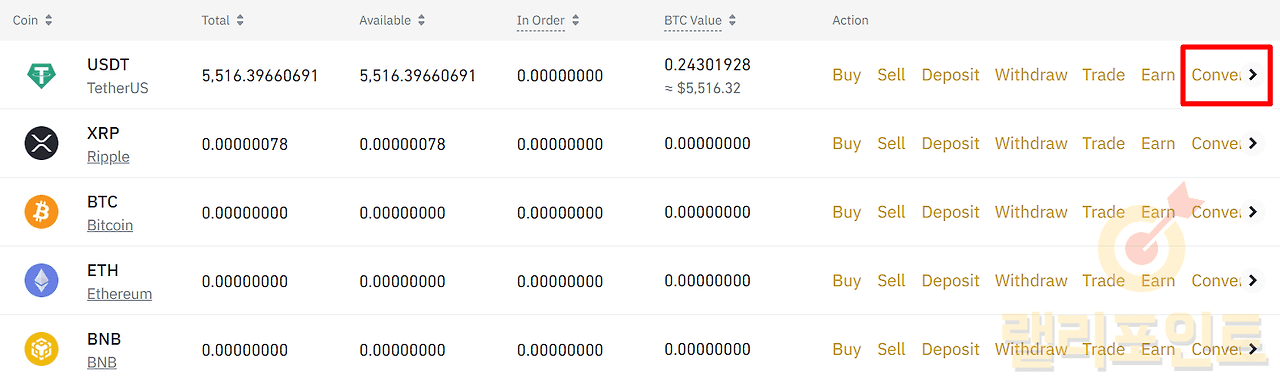 1. USDT 우측 Convert 버튼을 클릭합니다.