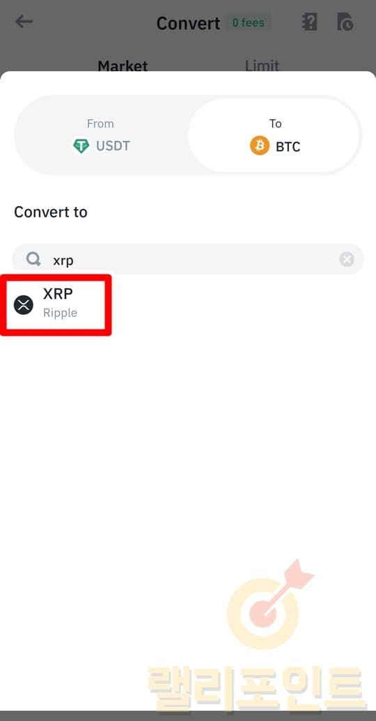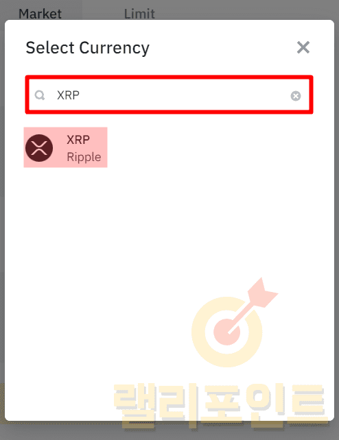 1. 변환할 항목을 누르고 XRP(리플)을 검색으로 찾은 후 선택합니다.