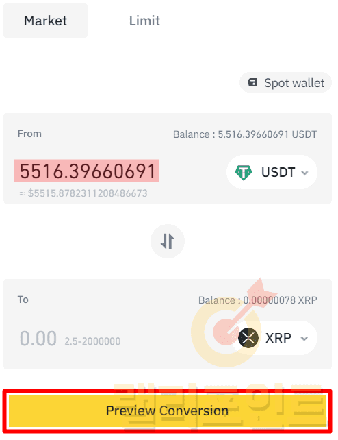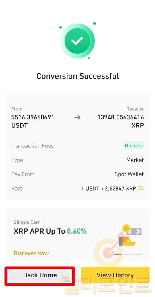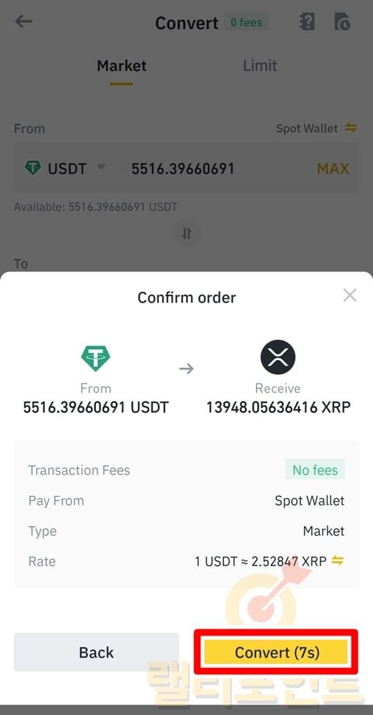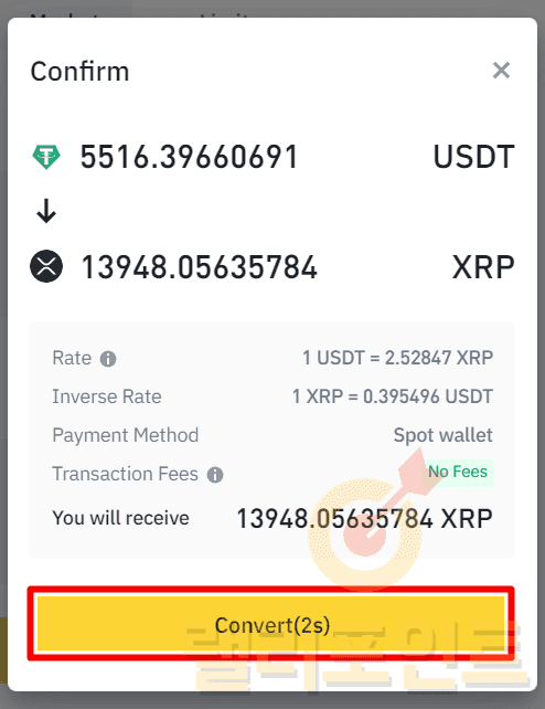 1. Convert 버튼을 누르면 선택한 코인으로 모두 변환됩니다.