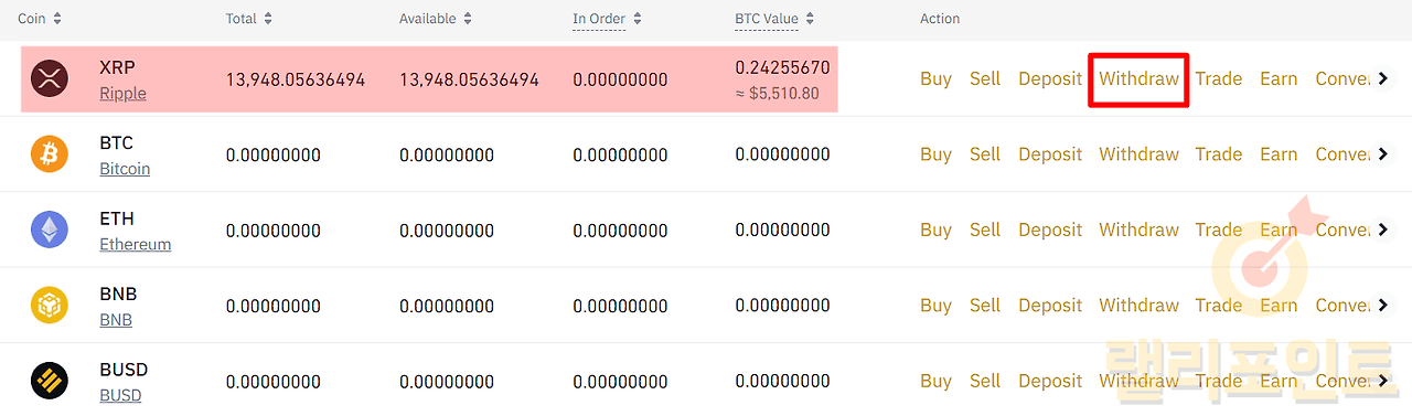 1. 변환된 리플을 확인하고 우측 Withdraw를 클릭합니다.