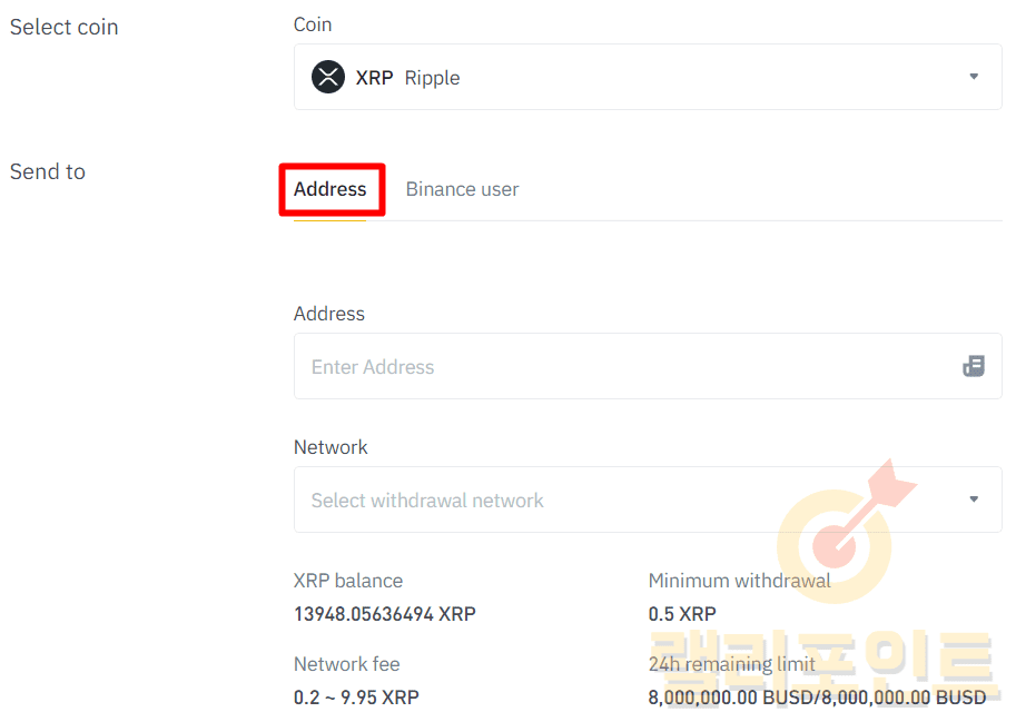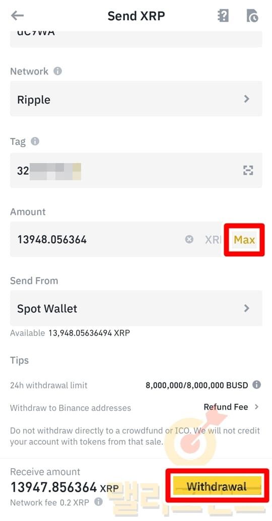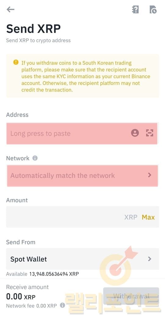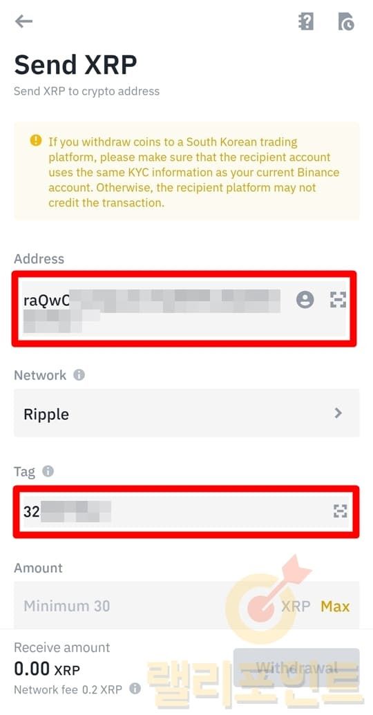 1. 다시 바이낸스 어플로 돌아와서 업비트에서 확인한 Address와 Tag를 입력합니다.