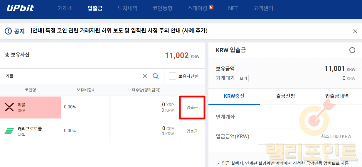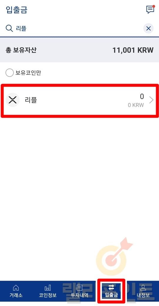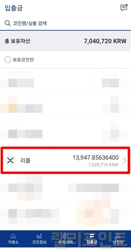1. 리플을 찾은 후 오른쪽 입출금을 클릭합니다.