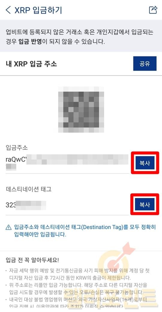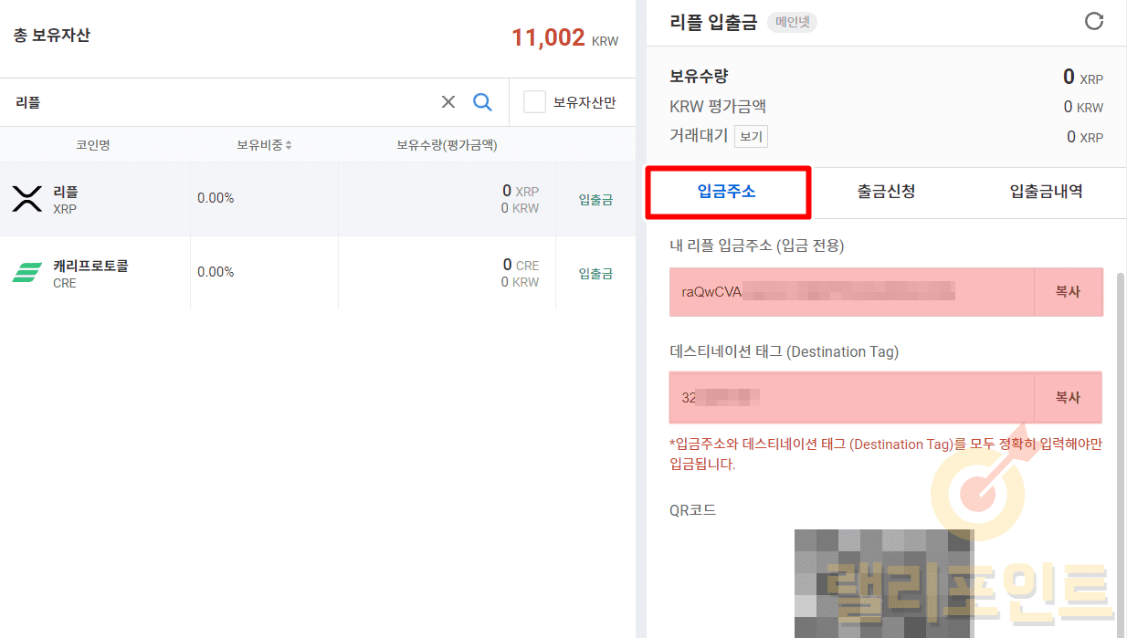 1. 나의 리플 입금주소 및 데스티네이션 태그를 확인 및 복사합니다.