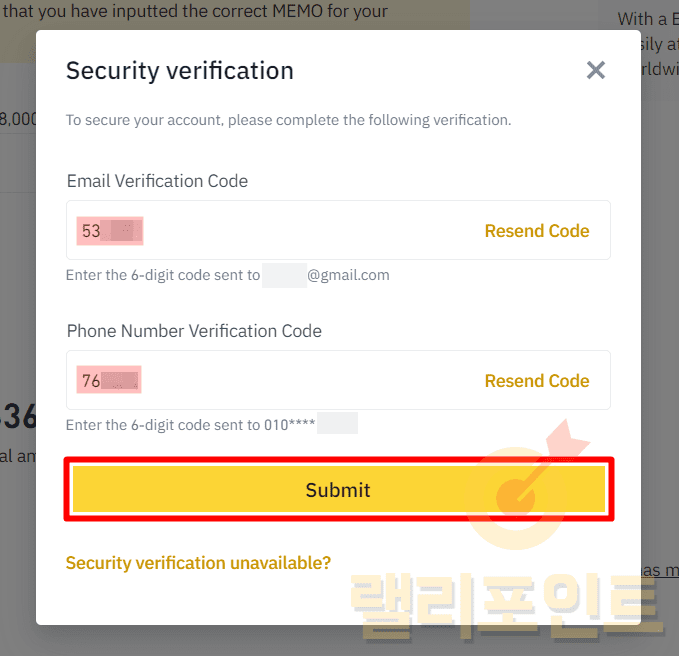 2. 바이낸스에 등록된 이메일/휴대폰에서 인증번호를 확인하고 기입합니다.