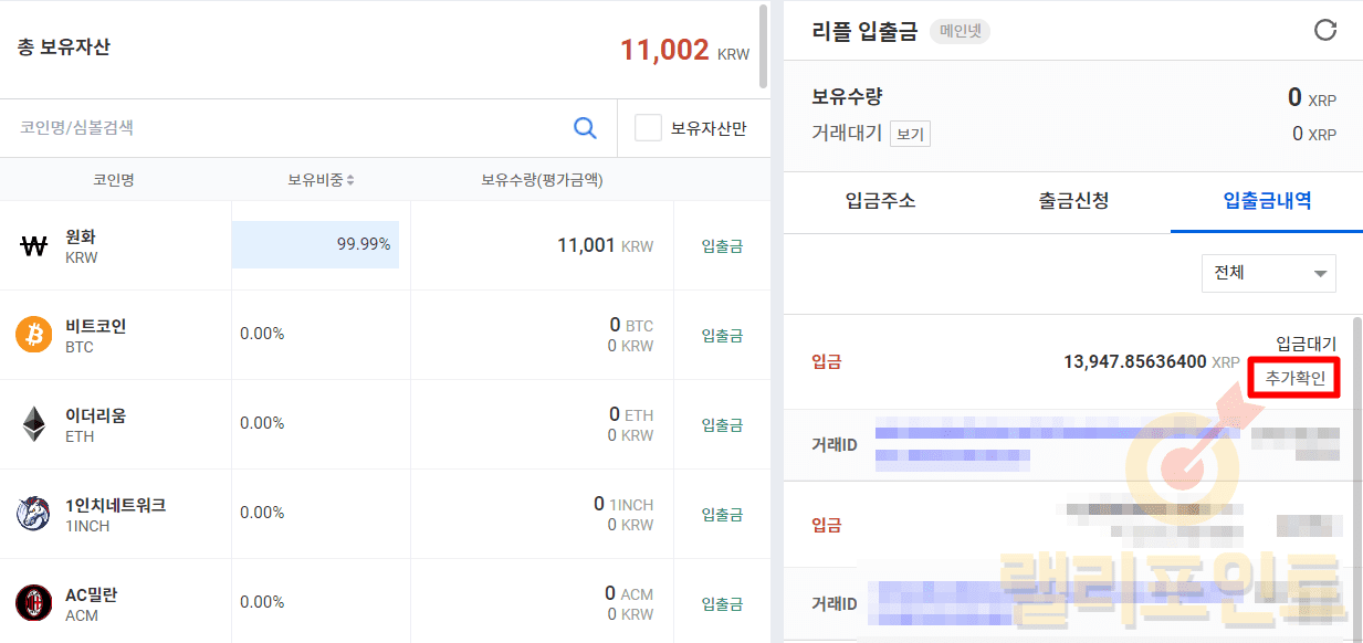 1. 리플 입출금 화면에서 입금대기 - 추가확인 버튼을 누릅니다.