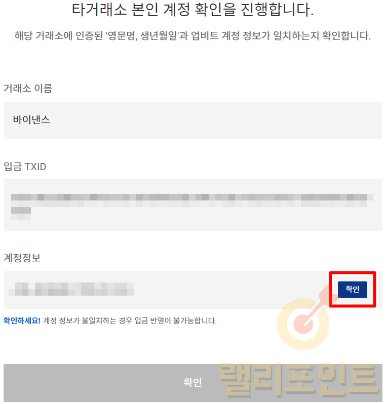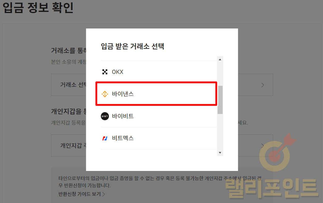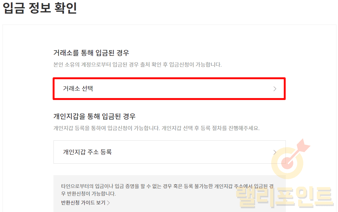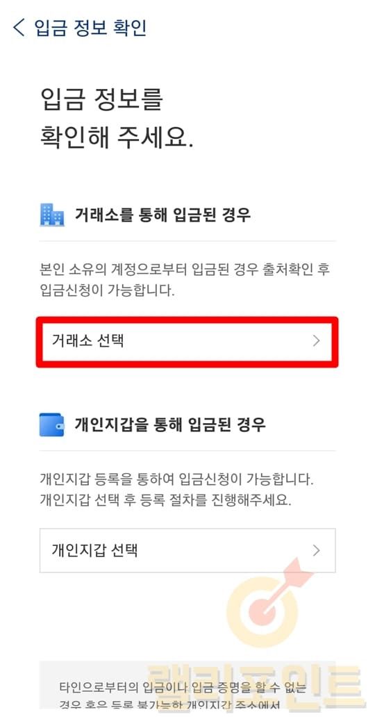 본인 소유의 계정으로부터 입금된 경우 출처 확인 후 입금신청이 가능합니다. 또 100만원 이상의 입금 건의 경우 연동된 거래소에서만 본인 확인 절차 후 입금됩니다. 참고로 해외 거래소에서 입금할 경우에는 위험평가 통과 VASP로부터의 입금만 가능하며 메인넷을 통한 입금만 지원합니다.