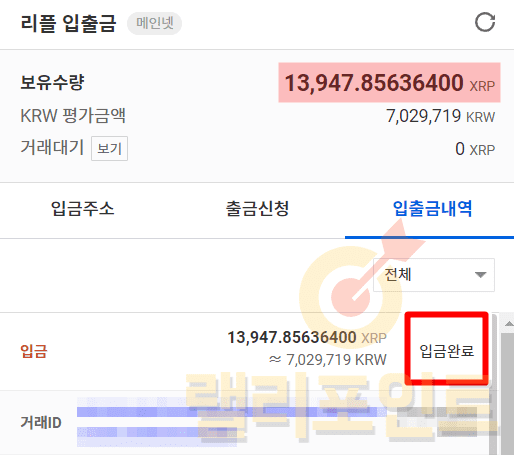 입금완료를 확인하시고 전송된 리플의 보유수량을 보시면 됩니다. 이제 원화로 돈을 출금하고 싶으시다면 업비트 원화 출금 방법 (수수료, 한도금액)을 이용하세요.
