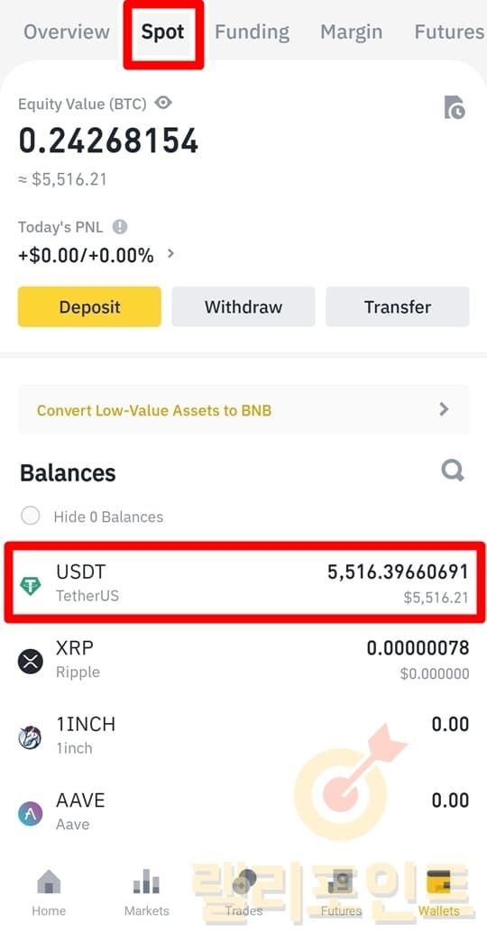 1. Wallets > Spot에서 전환된 USDT를 확인 후 클릭합니다.