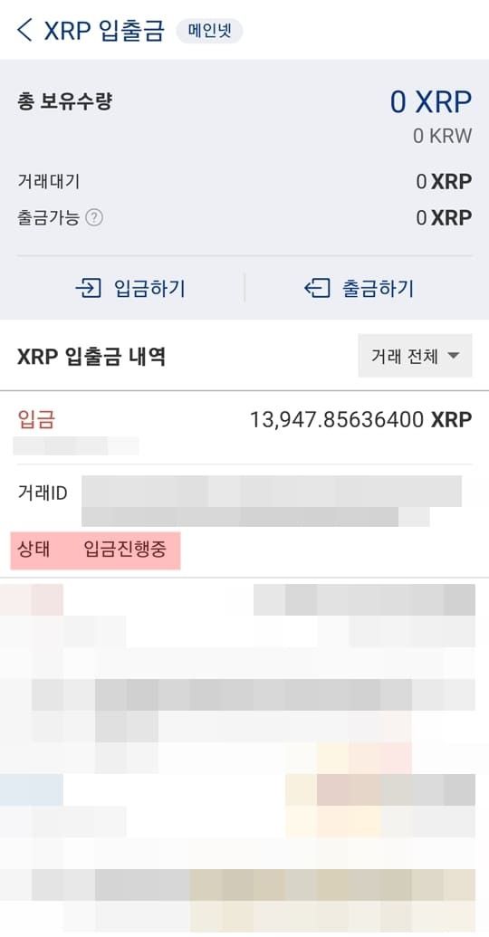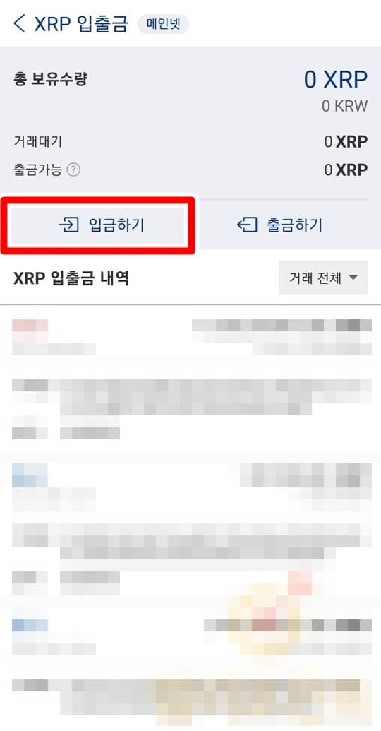 1. 업비트 어플을 실행하고 입출금 > 리플을 누릅니다.
