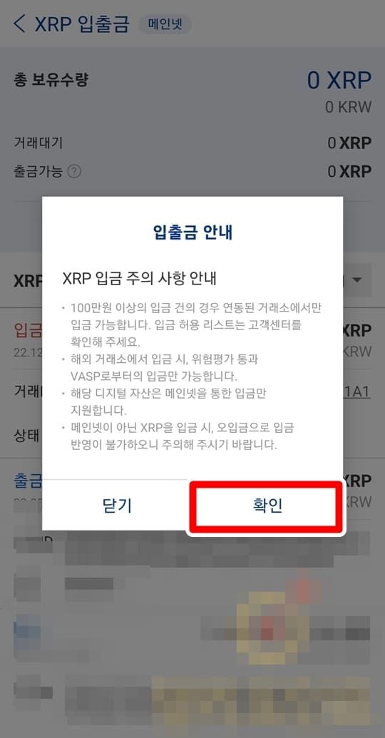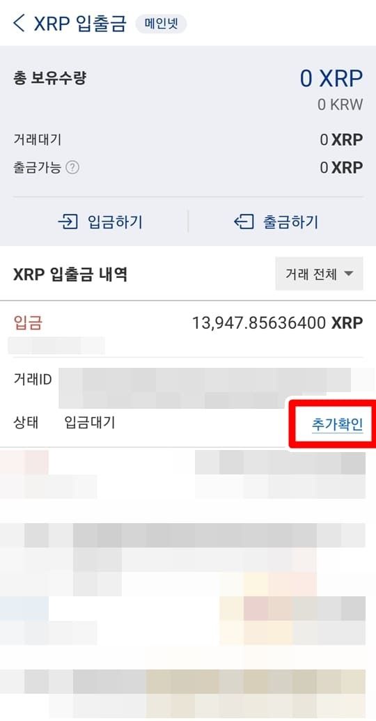 1. 업비트에서 리플 입금대기 우측의 추가확인을 클릭합니다.