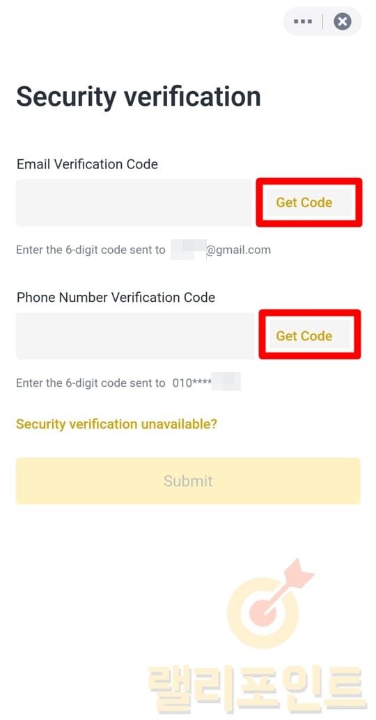 1. 이메일과 휴대폰 인증칸에서 모두 Get Code를 누릅니다.