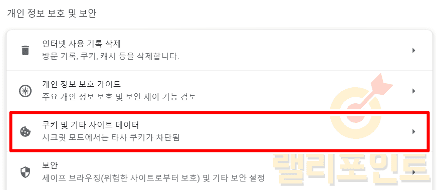 1. 쿠키 및 기타 사이트 데이터를 클릭합니다.