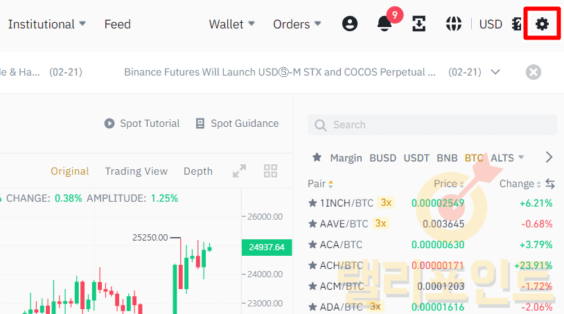 1. 바이낸스 사이트에서 우측 상단 설정 버튼을 누릅니다.