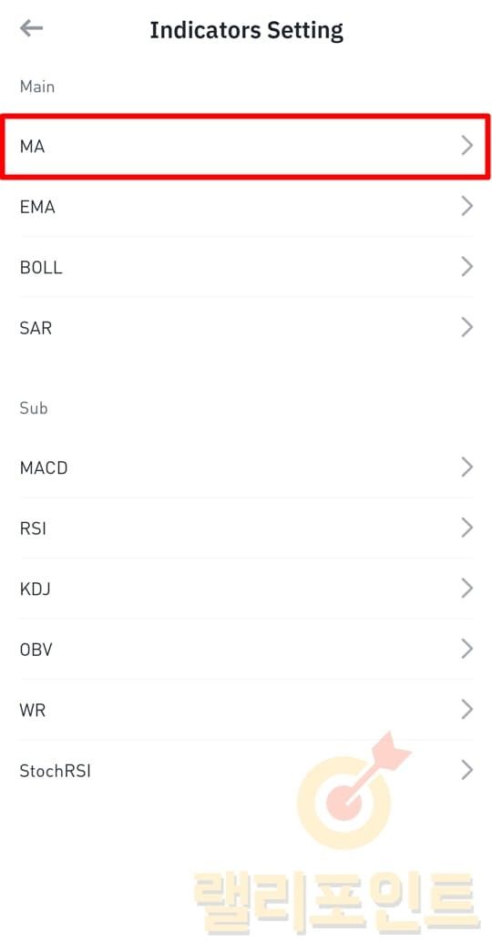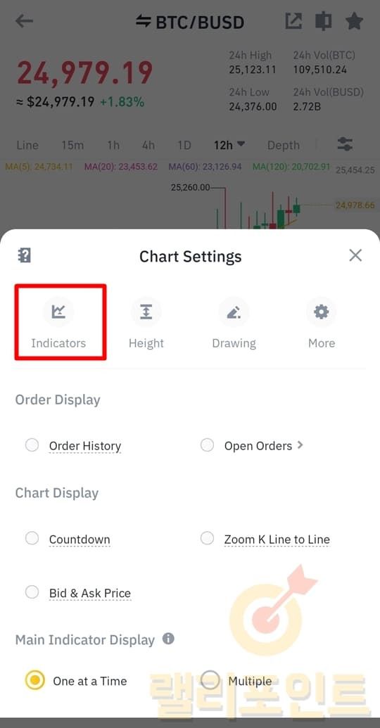 1. 바이낸스 차트에서 하단 활성화된 보조지표를 누릅니다.