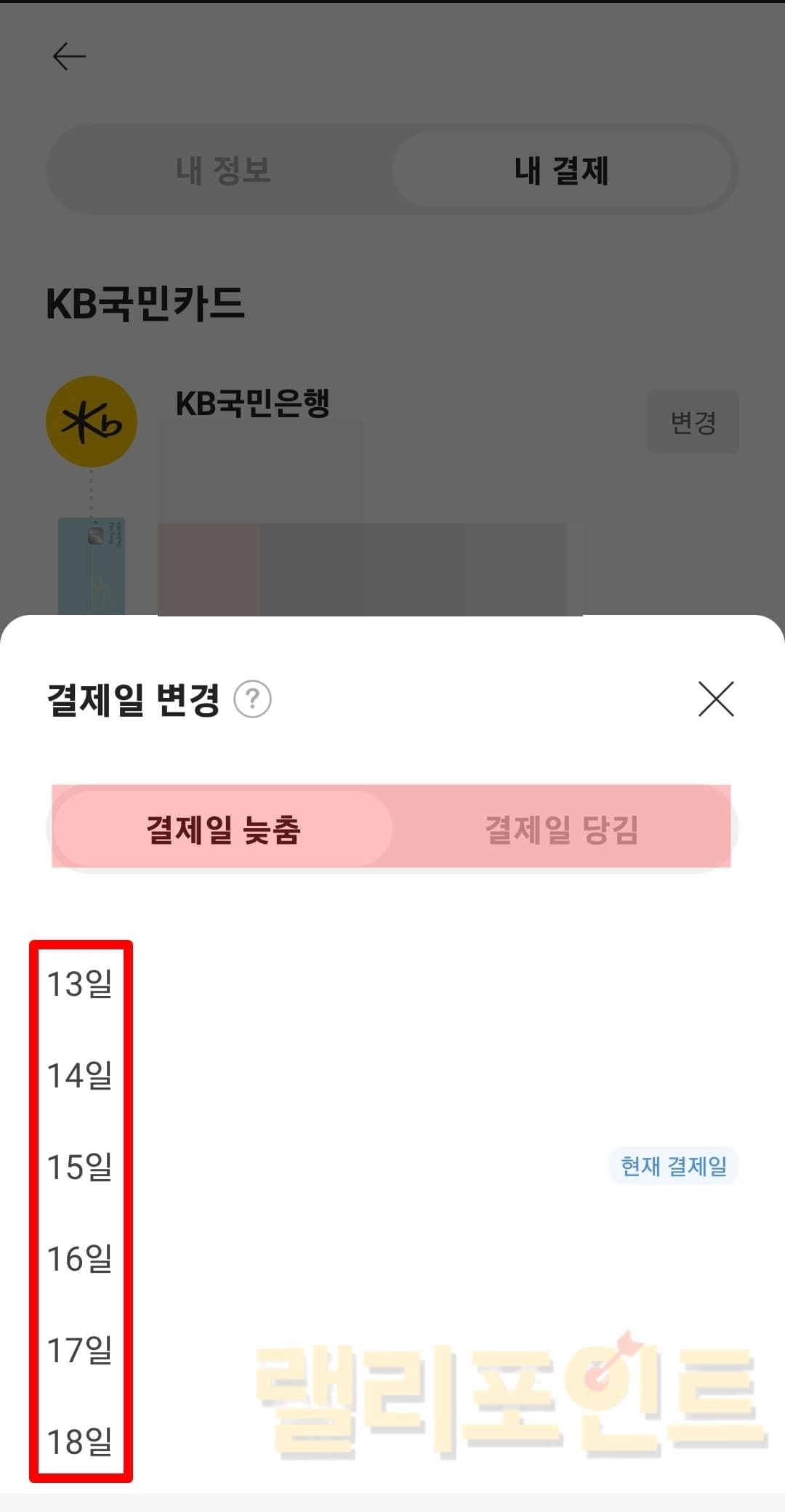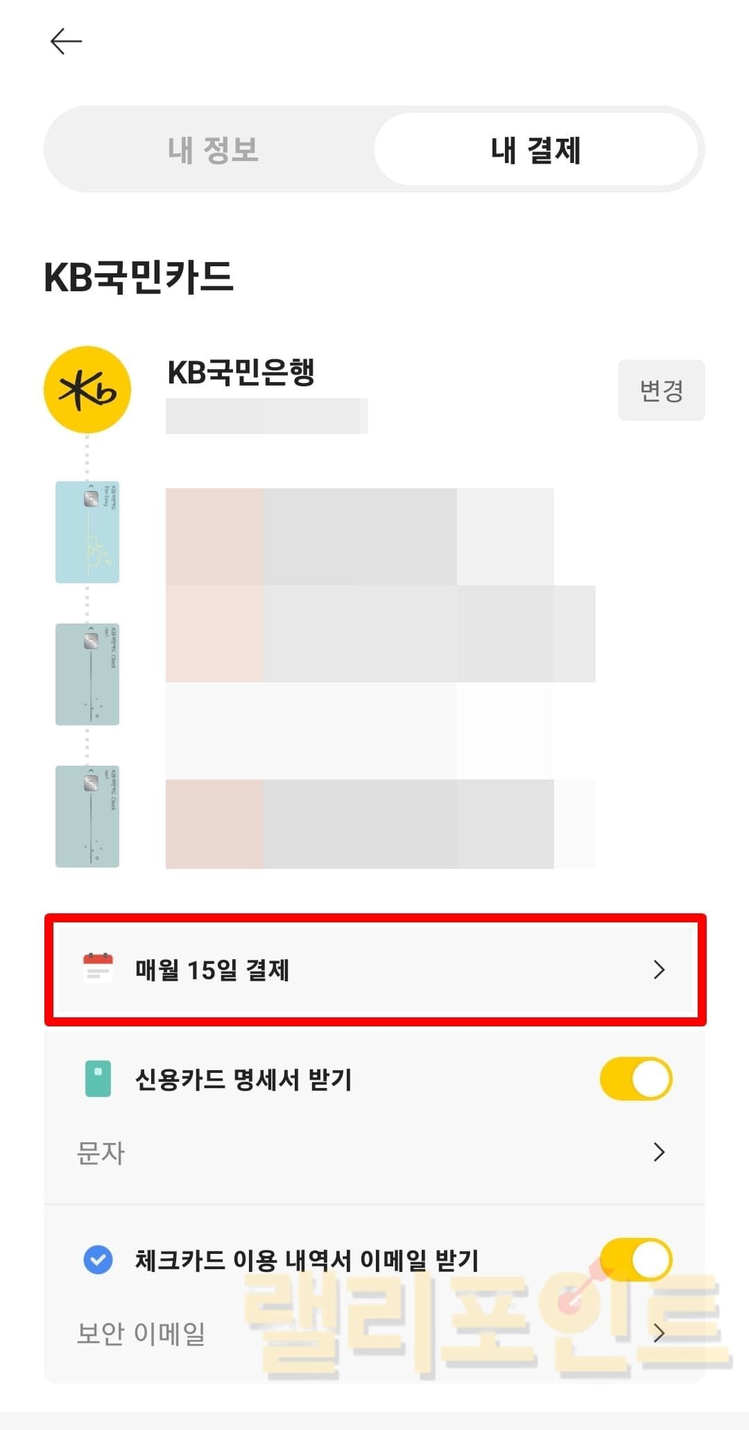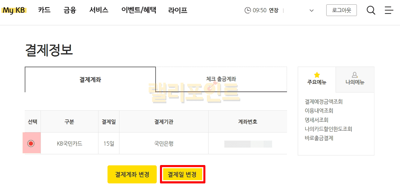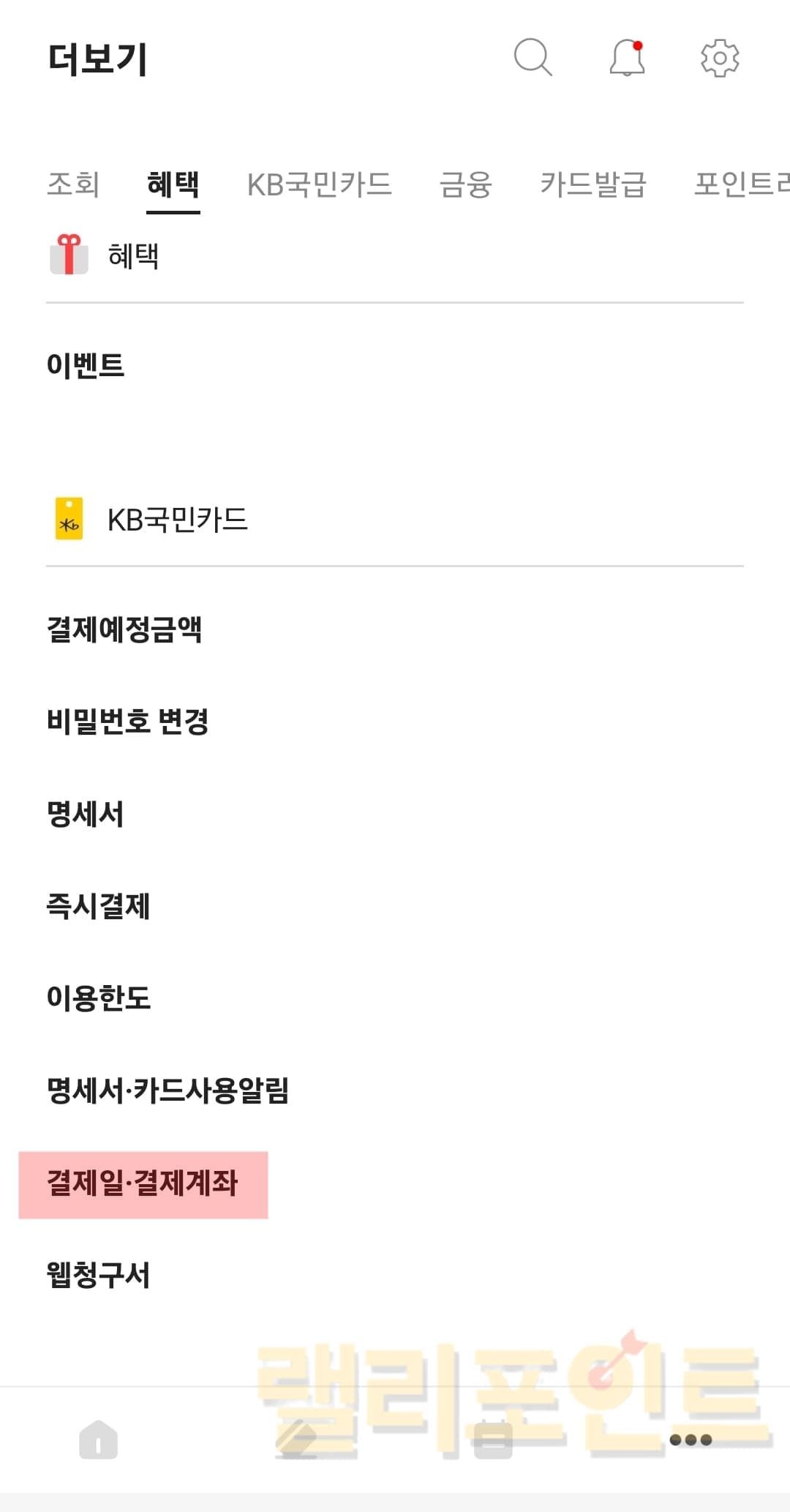 1. kb국민카드 > 결제일/결제계좌를 누릅니다.