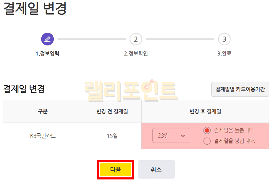 국민카드 결제일 변경시 3개월간 재변경이 불가능