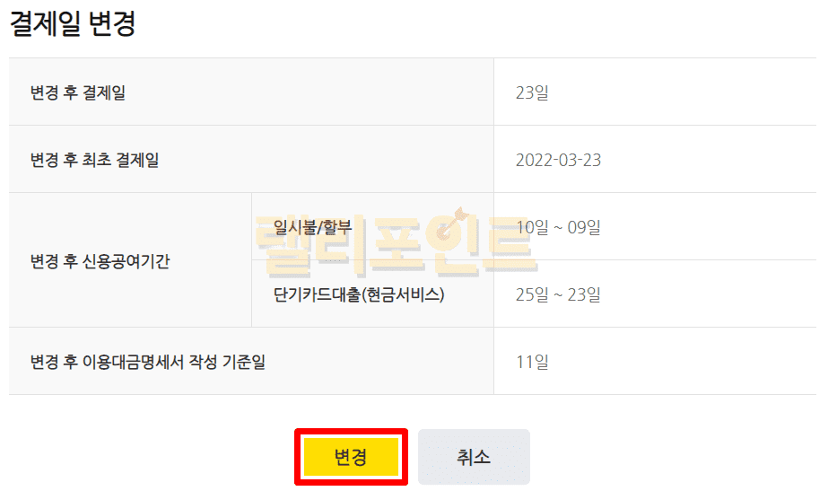 • 국민카드 결제일 변경시 일시불, 할부, 단기카드대출 이용기간의 변경에 따른 각종 수수료 금액이 변경될 수 있습니다.