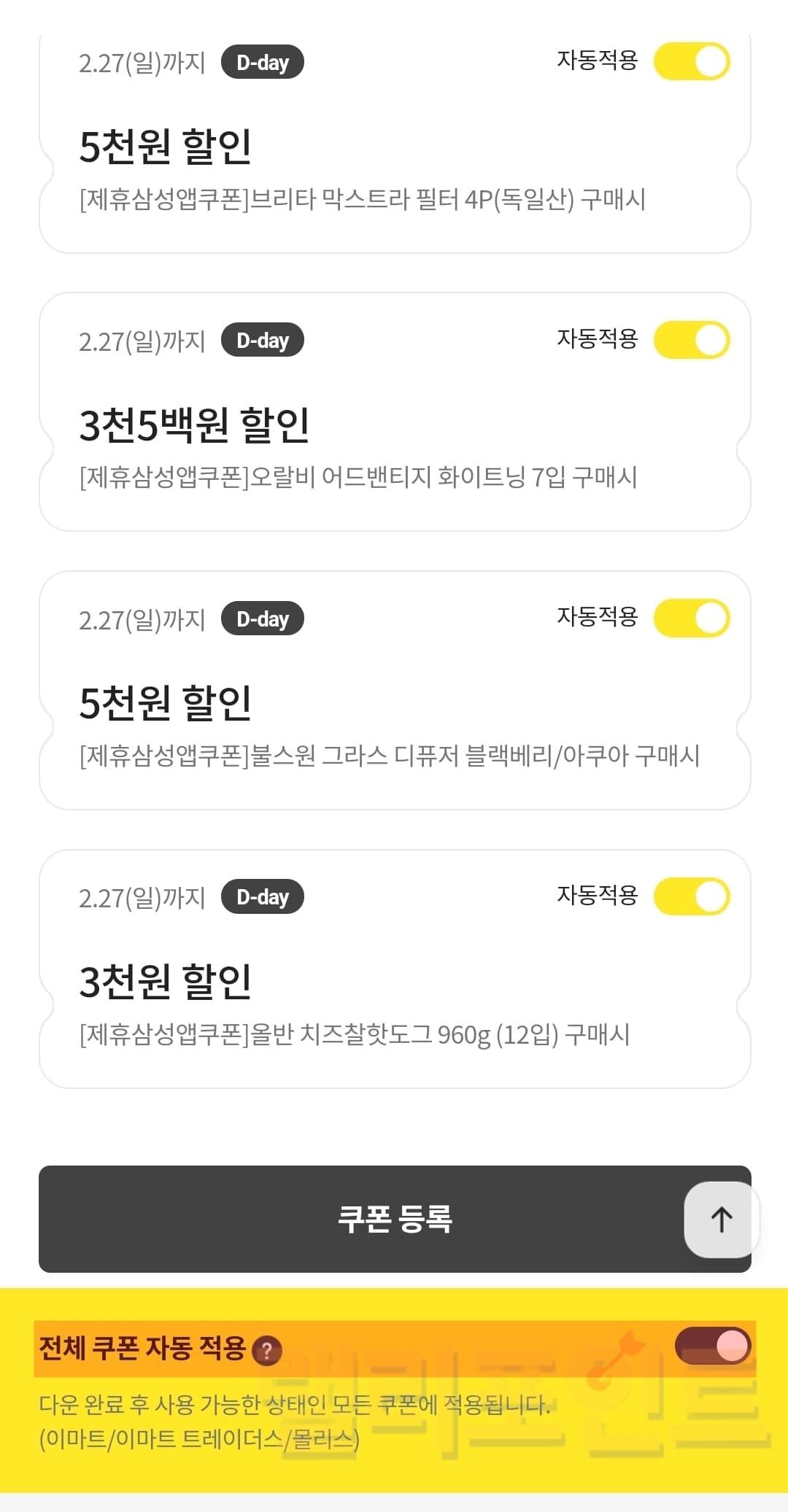 내가 받은 이마트 트레이더스 쿠폰을 모두 확인할 수 있습니다. 여기서 전체 쿠폰 자동 적용을 활성화하면 다운 완료 후 사용 가능한 상태인 모든 쿠폰을 자동으로 사용할 수 있습니다. 결제시 나의 정보로 이마트 적립을 하면 쿠폰이 자동 적용되니 참고하시길 바랍니다.