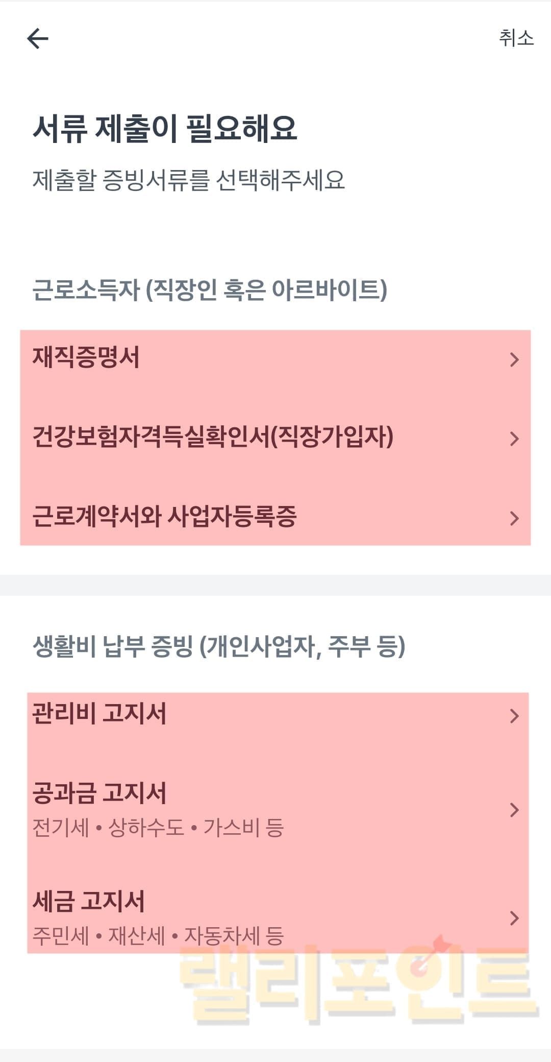 - 근로소득자 또는 생활비 납부 증빙에서 서류를 선택합니다.