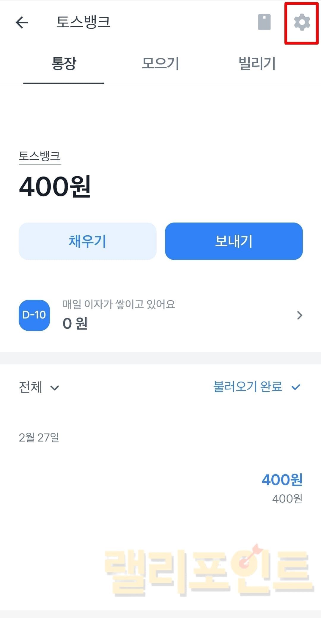- 나의 토스뱅크 페이지에서 설정 버튼을 클릭합니다.