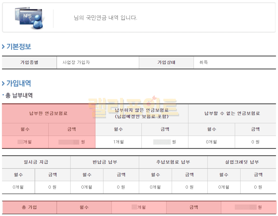 하단 총가입을 보면 최종 가입 월수와 납부 금액을 조회할 수 있습니다.