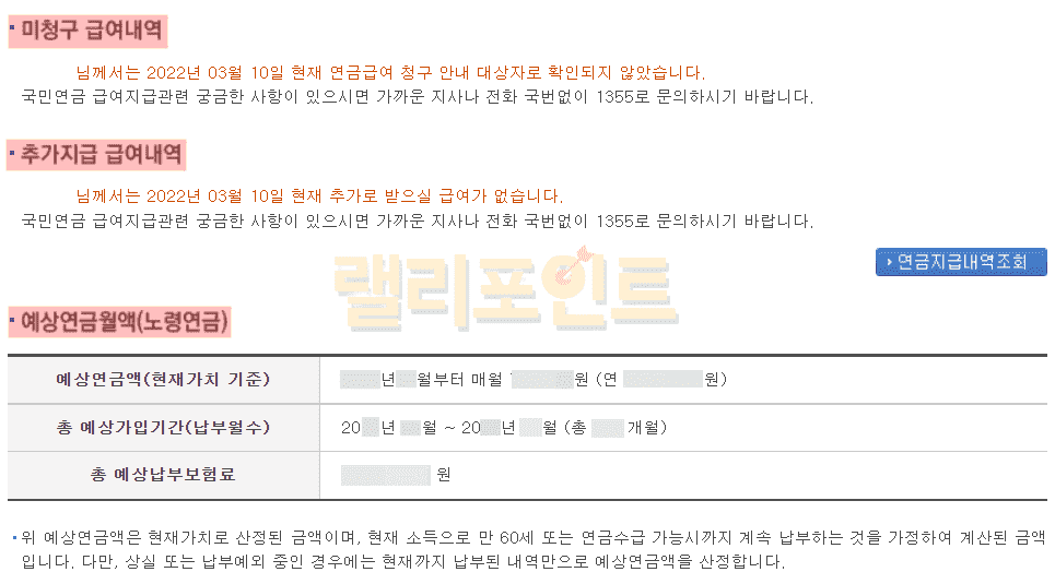 아래에서는 미청구 급여내역 / 추가지급 급여내역 / 예상연금월액(노령연금)을 조회해볼 수 있습니다.