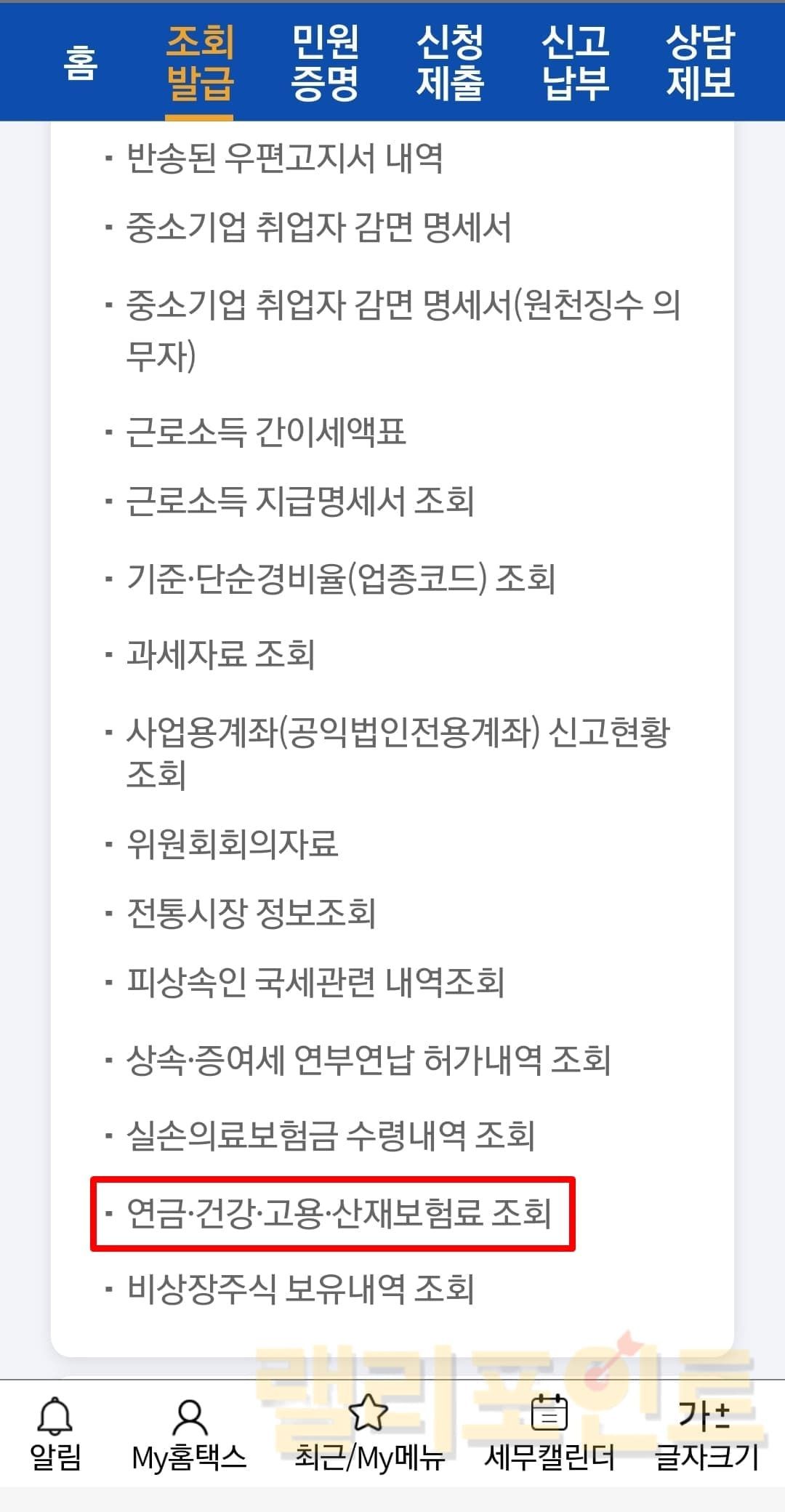 - 연금/건강/고용/산재보험료 조회를 클릭합니다.