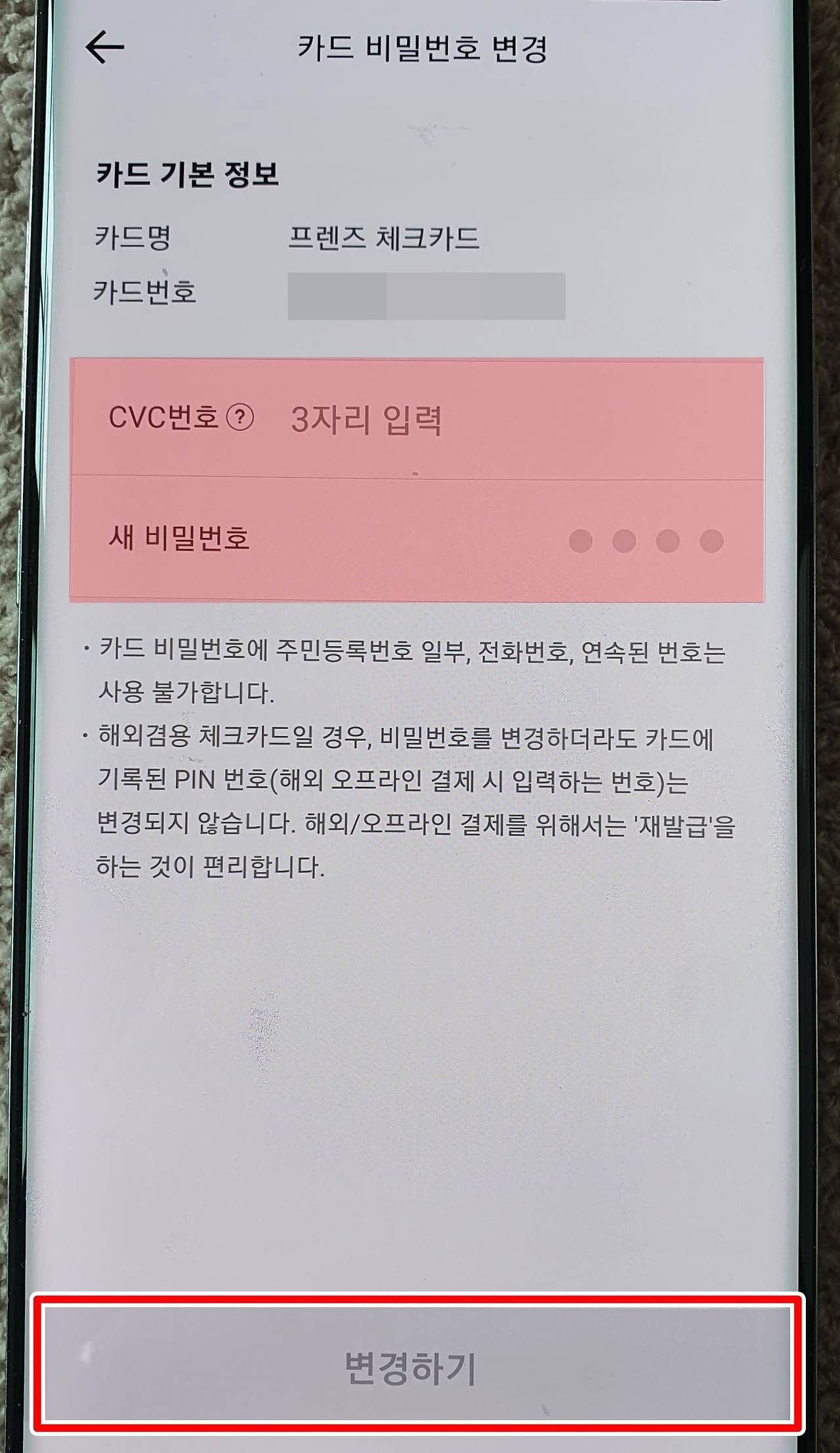 이렇게 카카오뱅크 카드 비밀번호 변경을 위해서는 카드에 있는 CVC번호 숫자 3자리를 알아야 합니다. 따라서 카드 분실 상태가 아니라면 쉽게 해결이 가능하며 분실을 했다면 카카오뱅크 카드 분실시 재발급 받는 방법 (신고절차, 기간) 글을 참고하시길 바랍니다.