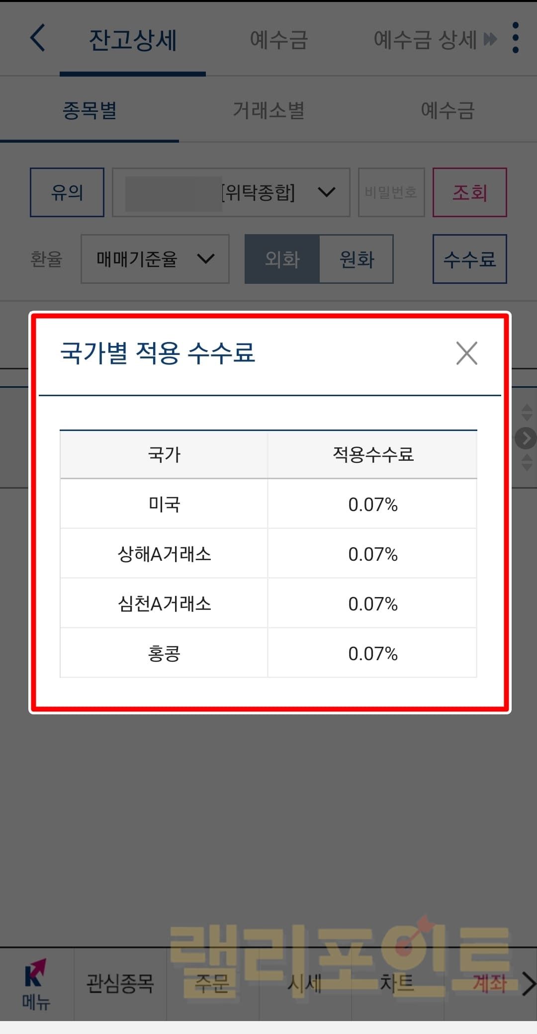저의 경우 키움증권 해외주식 수수료 이벤트 혜택을 적용받았기 때문에 미국, 상해A거래소, 심천A거래소, 홍콩 모두 0.07% 수수료를 적용받고 있음을 확인할 수 있었습니다.