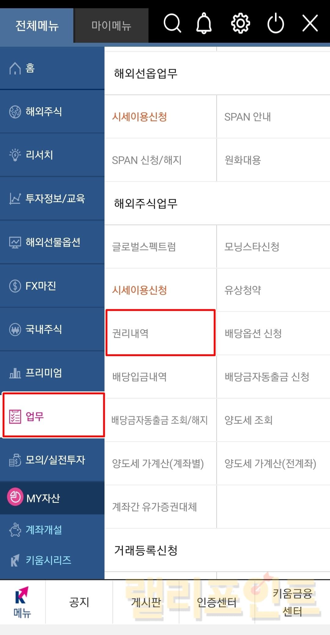 업무 > 해외주식업무 > 권리내역을 클릭합니다.