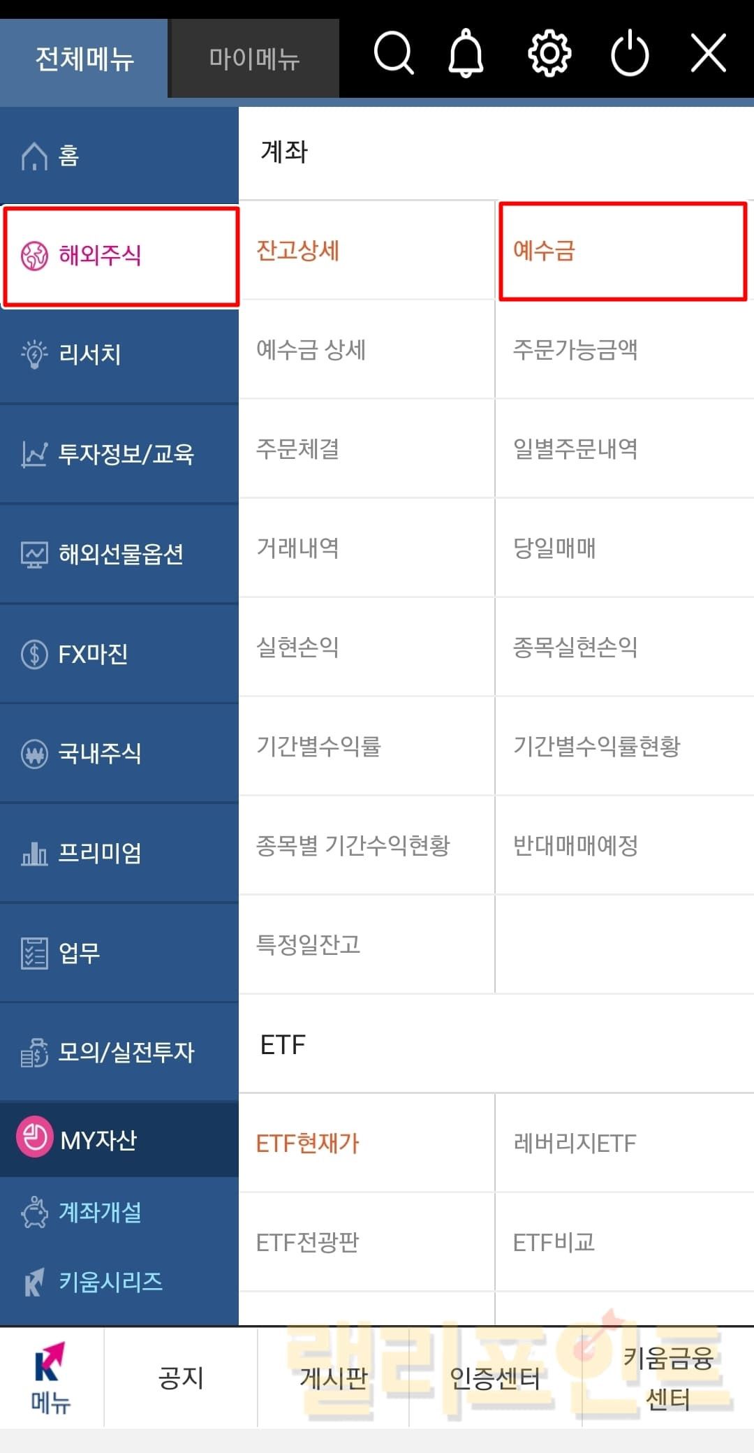 영웅문S 글로벌 앱 > 메뉴 > 해외주식 > 예수금을 클릭합니다.
