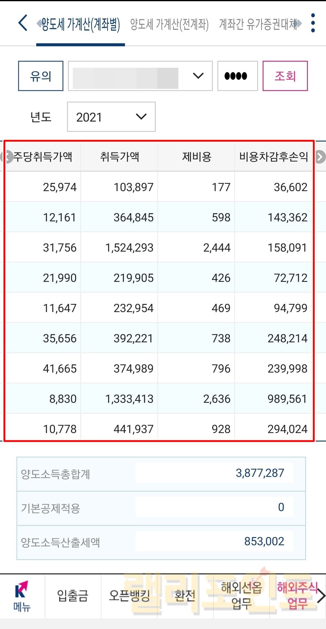이를 활용해서 1년의 차익수익을 250만원 이하로 맞춰주시면 별도의 양도소득세 납부/신고가 필요없어지기 때문에 연말쯤에 금액을 확인한 후 애매하게 넘겨진 250만원 이상의 금액을 없애기 위해 손실을 보고 있는 주식을 일부 팔아서 250만원 이하로 맞추시는 투자자분들이 많습니다. 다만, 키움증권 양도소득세 대행 신고를 이용하면 큰 어려움없이 편리하게 신고/납부 절차를 진행할 수 있어서 억지로 수익금액을 맞출 필요는 없습니다.
