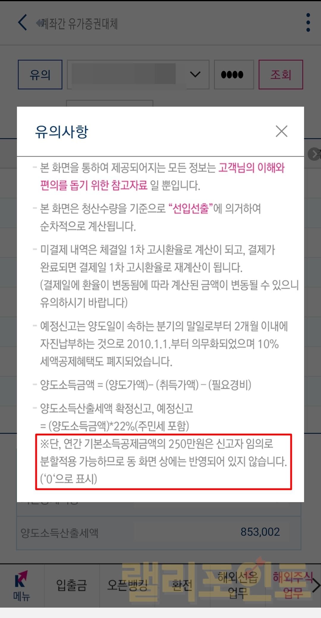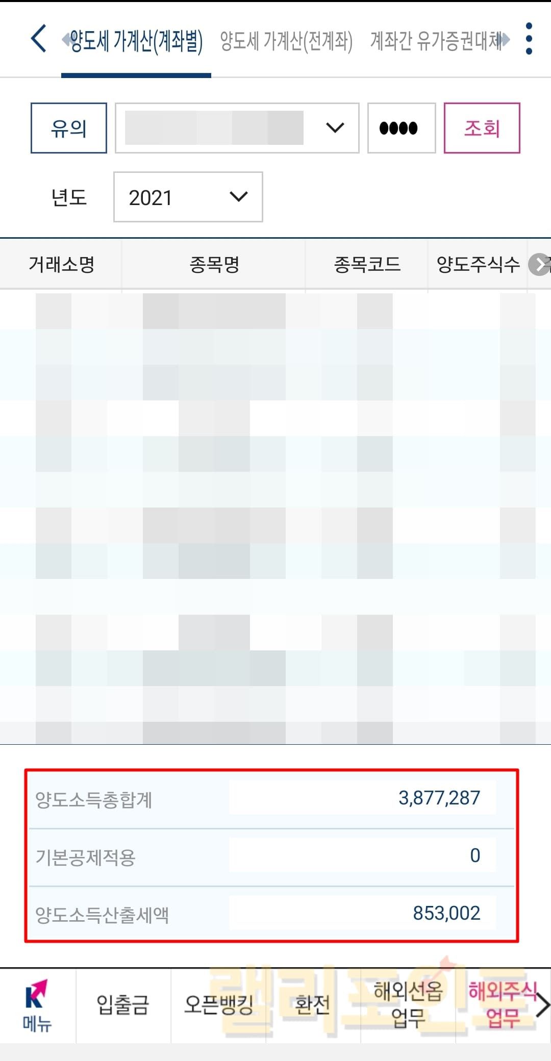 ※ 주의하실 것은 키움증권 양도소득산출세액은 본인이 직접 다시 계산해봐야 한다는 것입니다. 왜냐하면 연간 기본소득공제금액인 250만원은 신고자 임의로 분할적용이 가능함으로 화면 상에는 반영되지 않아 기본공제적용이 0원으로 계산되었기 때문입니다.