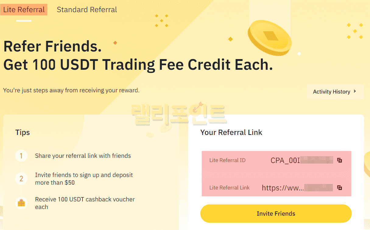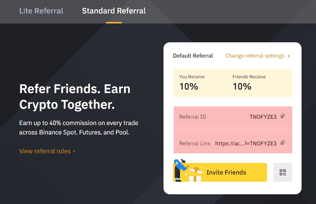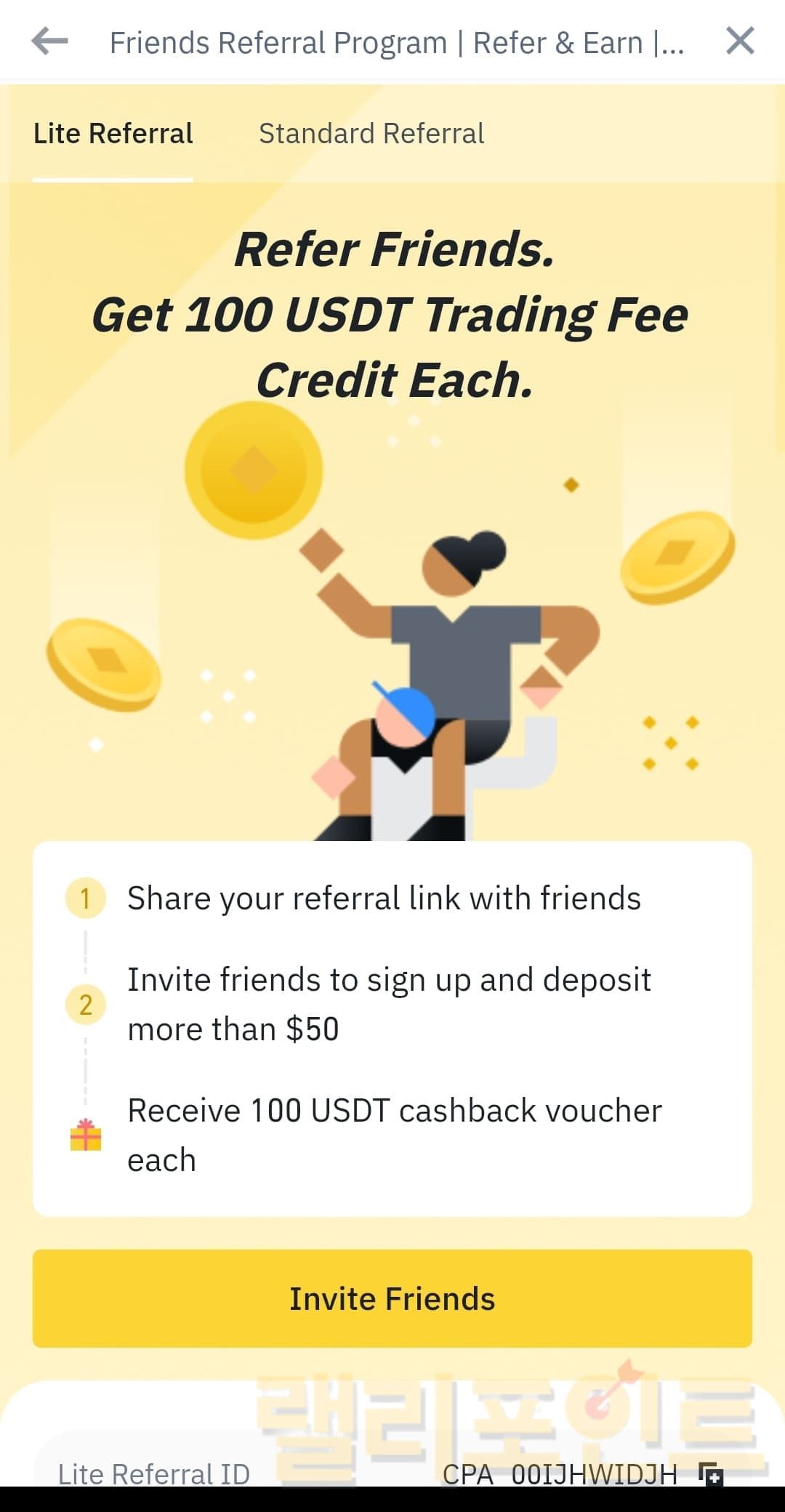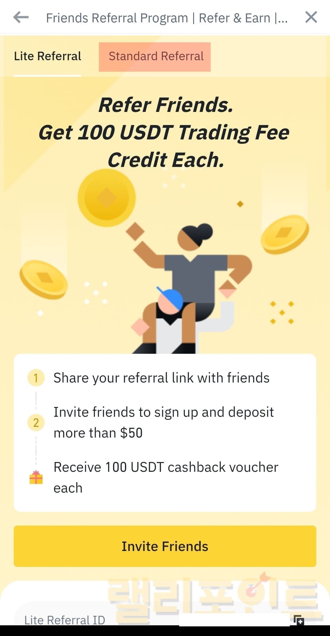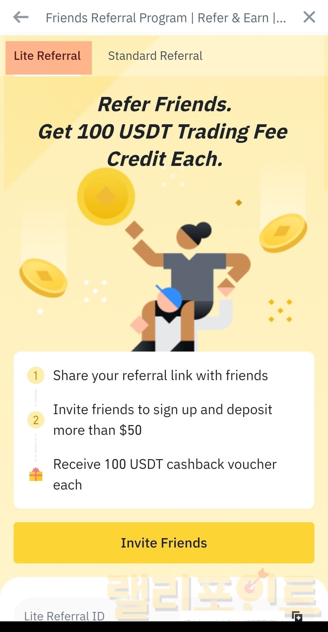 바이낸스 현물 레퍼럴 코드는 LITE Referral/Standrard Referral로 구분된다. 라이트는 친구가 가입 후 50달러 입금시 각각 100 USDT를 캐시백받는 것이며 스탠다드는 현물 거래시 등록 친구의 수수료에 대한 커미션을 각각 받는 것이다. 보통 스탠다드 래퍼럴이 많이 사용된다.