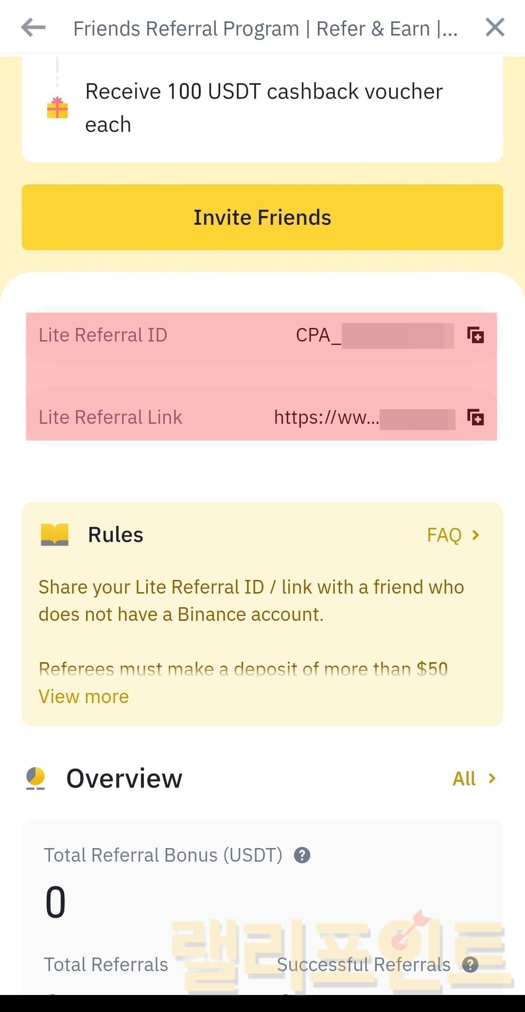 - Lite Referral에서 나의 레퍼럴 아이디와 링크를 확인합니다.
