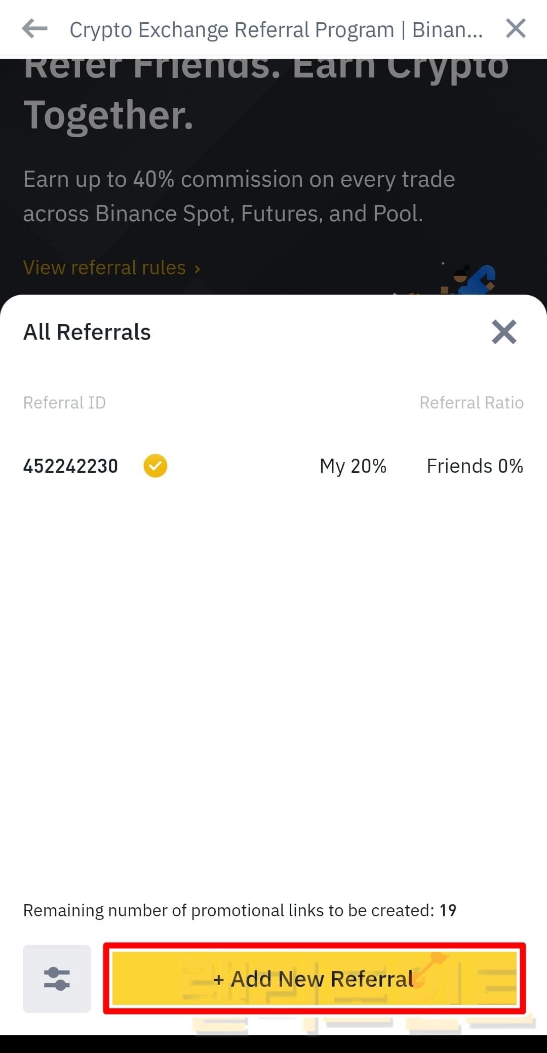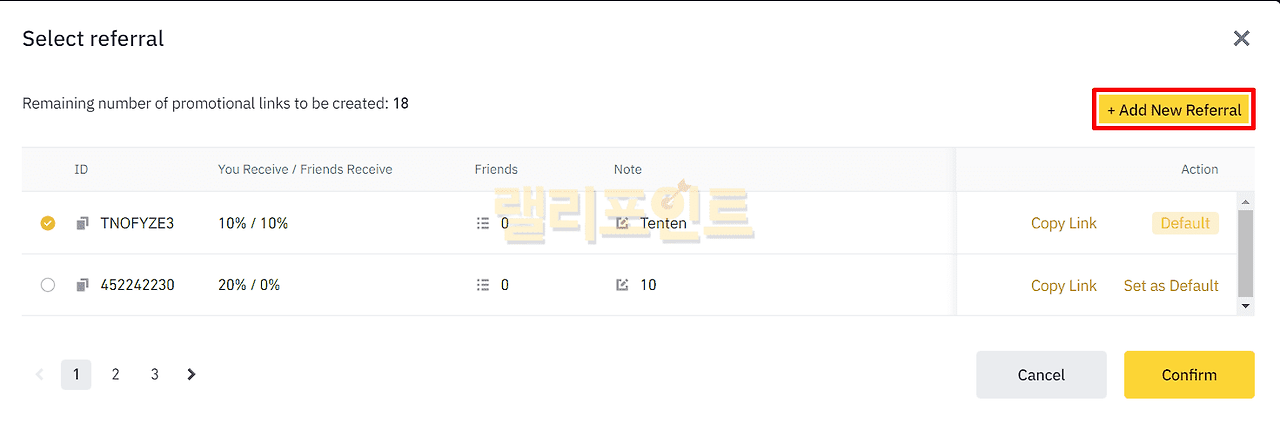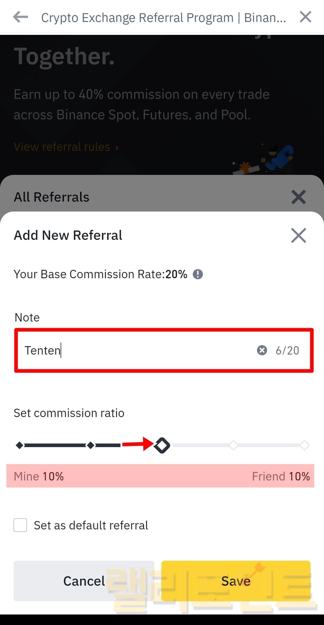 스탠다드 래퍼럴 기본 설정은 나의 혜택 20%, 등록한 상대방 혜택 0%입니다. 이것은 등록한 상대방은 혜택을 전혀 받을 수 없는 것이기 때문에 아래 방법으로 10%/10%로 바이낸스 현물 래퍼럴 코드를 생성하시길 바랍니다.