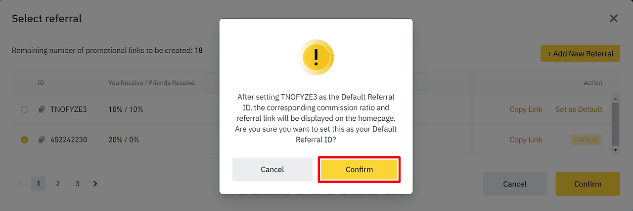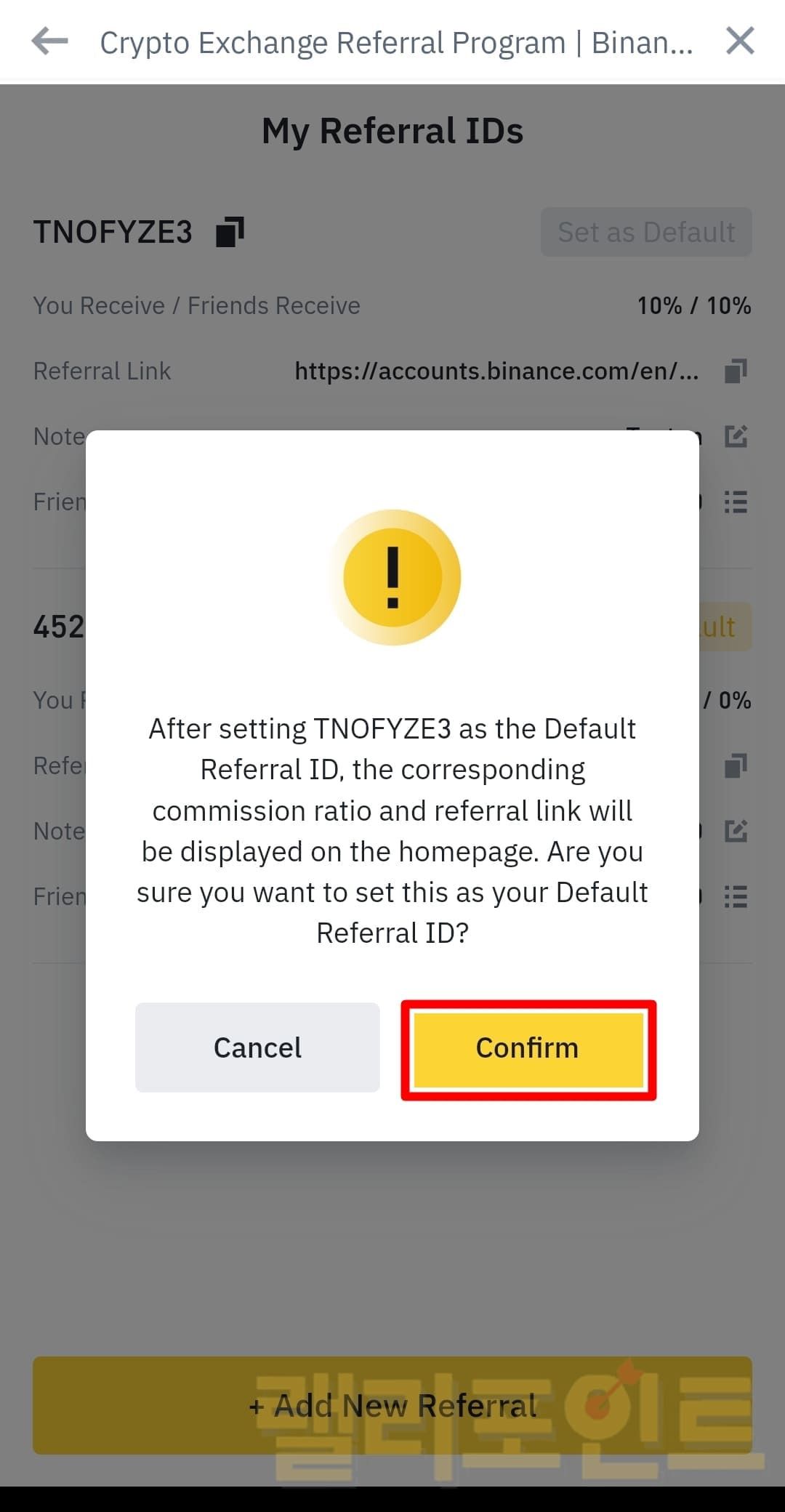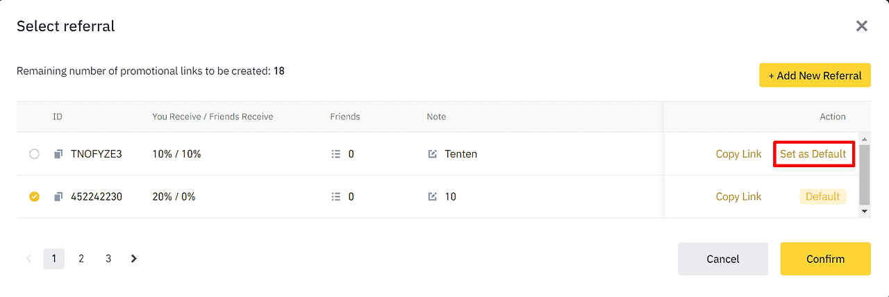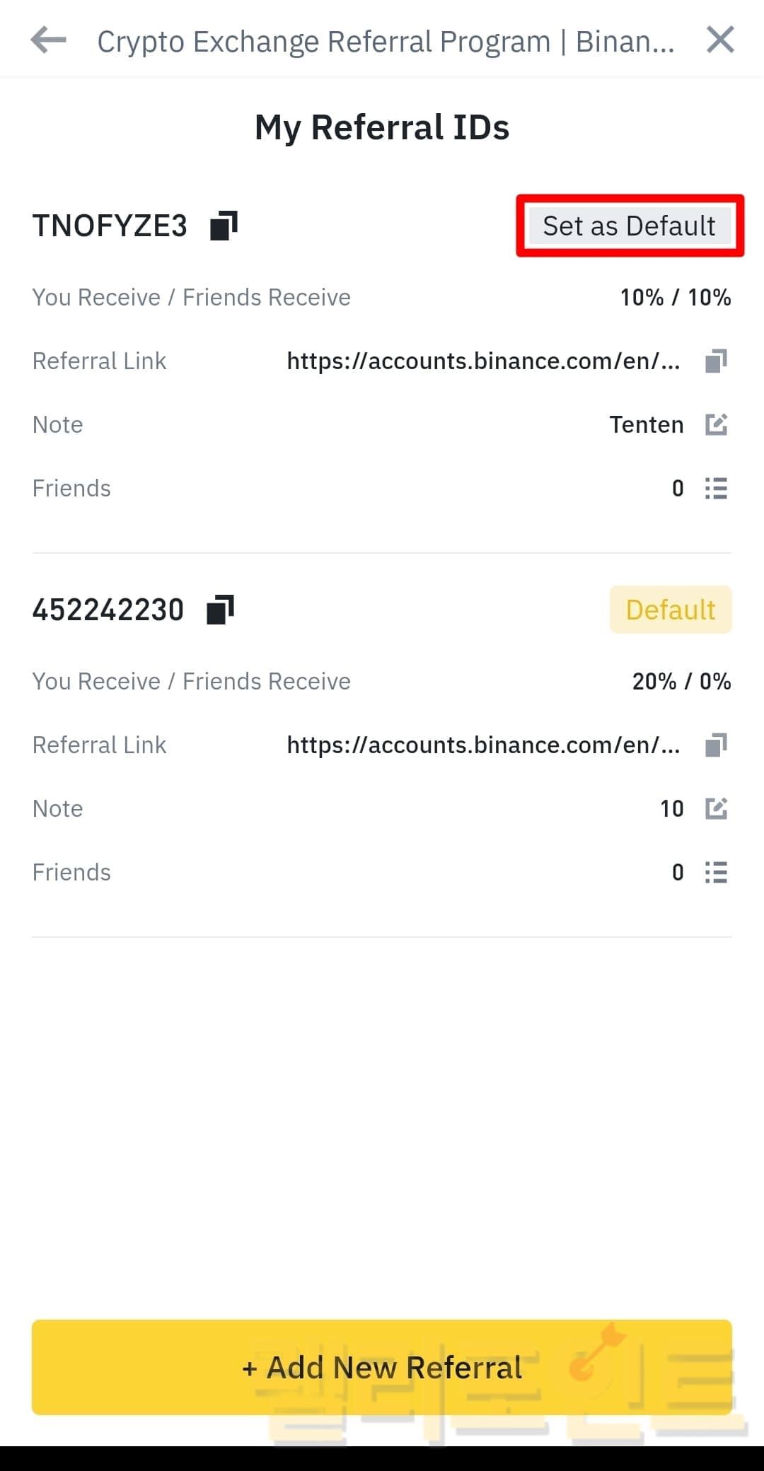 - 만든 레퍼럴의 오른쪽에서 Set as Default를 누릅니다.