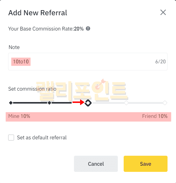 보통 본인과 상대방 모두 동등하게 혜택을 받을 수 있도록 10%/10%로 조절하는 편입니다. Set commission ratio를 중간으로 설정해주시면 됩니다.