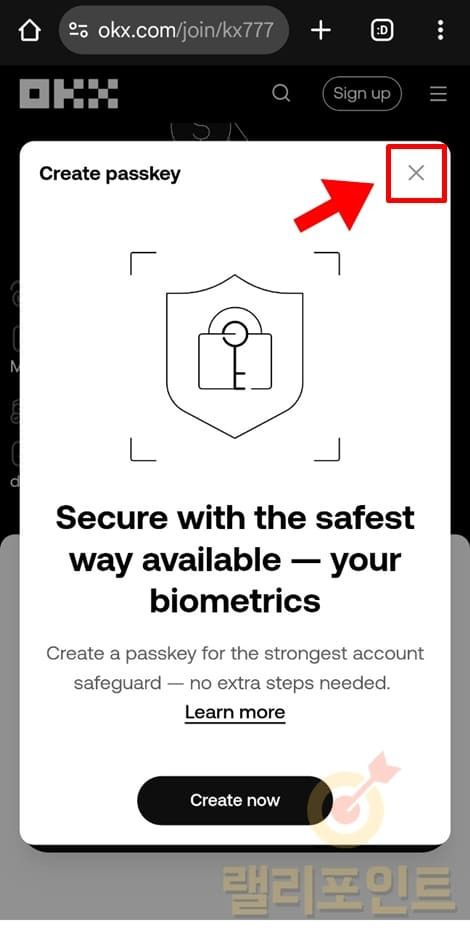 - 패스키 안내 창에서 X를 눌러 닫습니다.