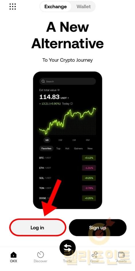 - OKX 앱을 실행하고 Log in 버튼을 클릭합니다.