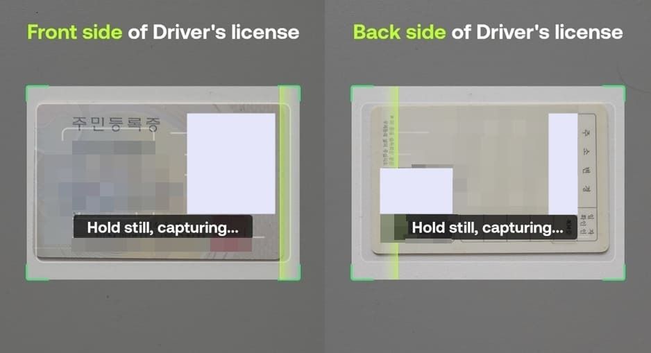 카메라가 실행되면 선택한 신분증을 사각 프레임에 맞춰주시면 자동으로 인식 후 스캔됩니다. 앞면부터 진행하며 스캔 완료 후 next 후 뒷면 촬영을 진행됩니다.