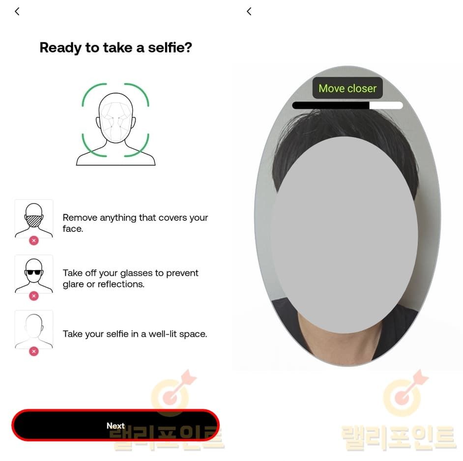 OKX 얼굴 인증시 카메라에 화면을 가까이 대셔서 Move Closer 게이지가 우측 끝까지 밀어져야 스캔이 완료됩니다.